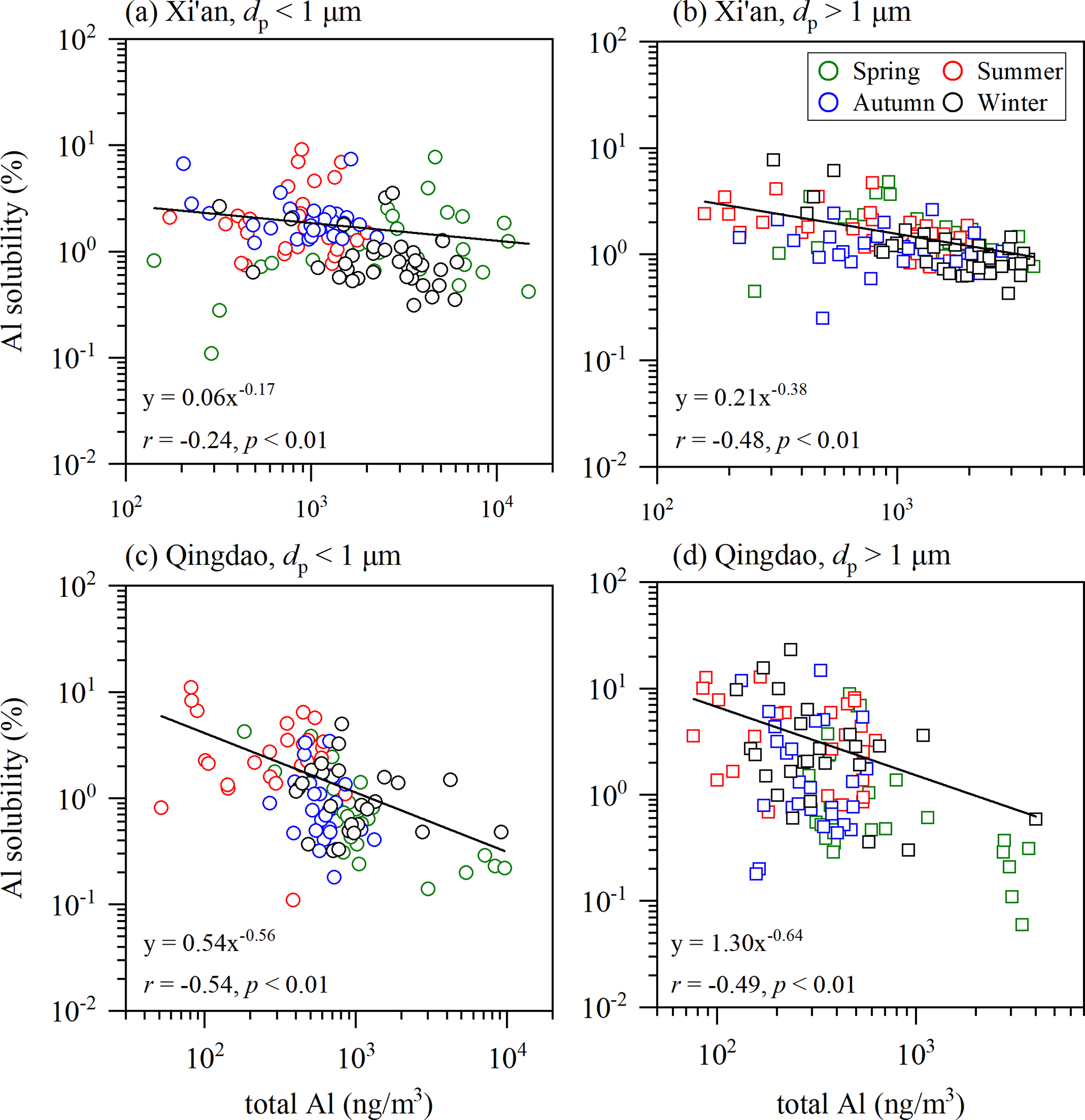As shown in Fig. 5, our work observed the inverse dependence of aerosol Al solubility on total Al concentrations at both Xi'an and Qingdao, given by Eq. (1):
