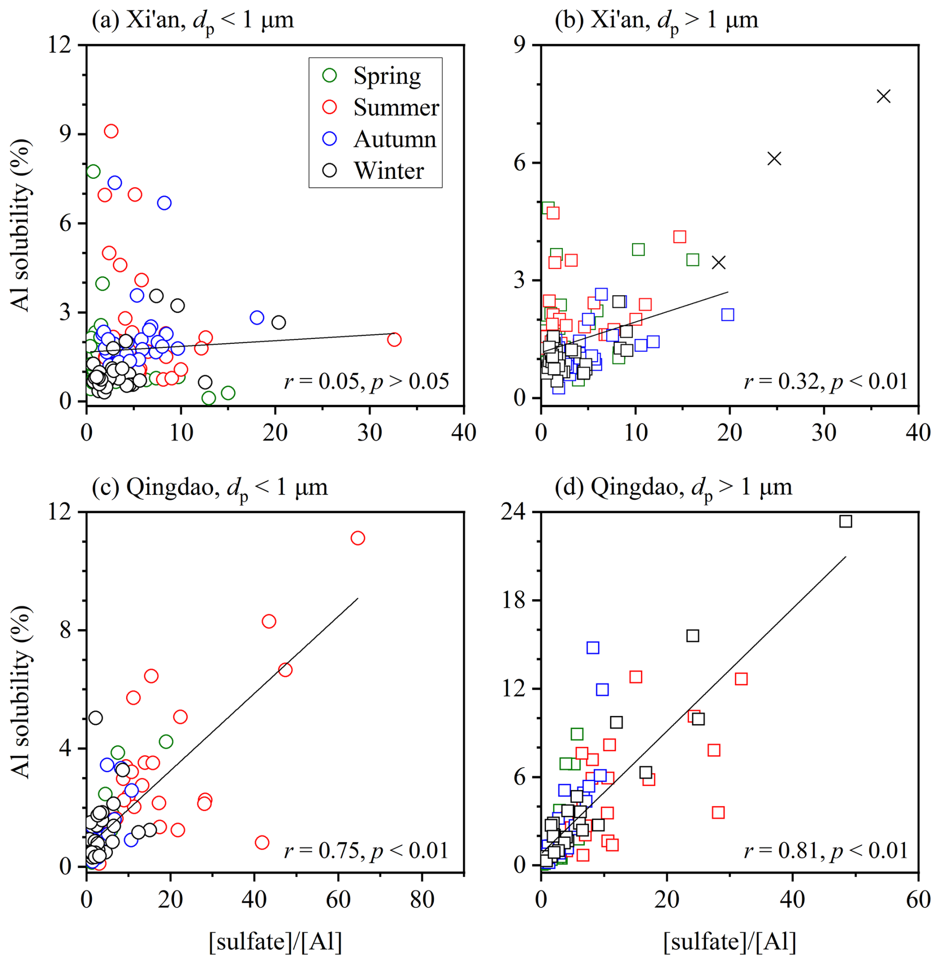 Figure 6Aerosol Al solubility versus [sulfate]/[Al]: (a) submicron particles at Xi'an, (b) supermicron particles at Xi'an, (c) submicron particles at Qingdao, (d) supermicron particles at Qingdao (the r value changed from 0.81 to 0.74 if the data point with the highest Al solubility was excluded). Data represented by crosses are not included in fitting.