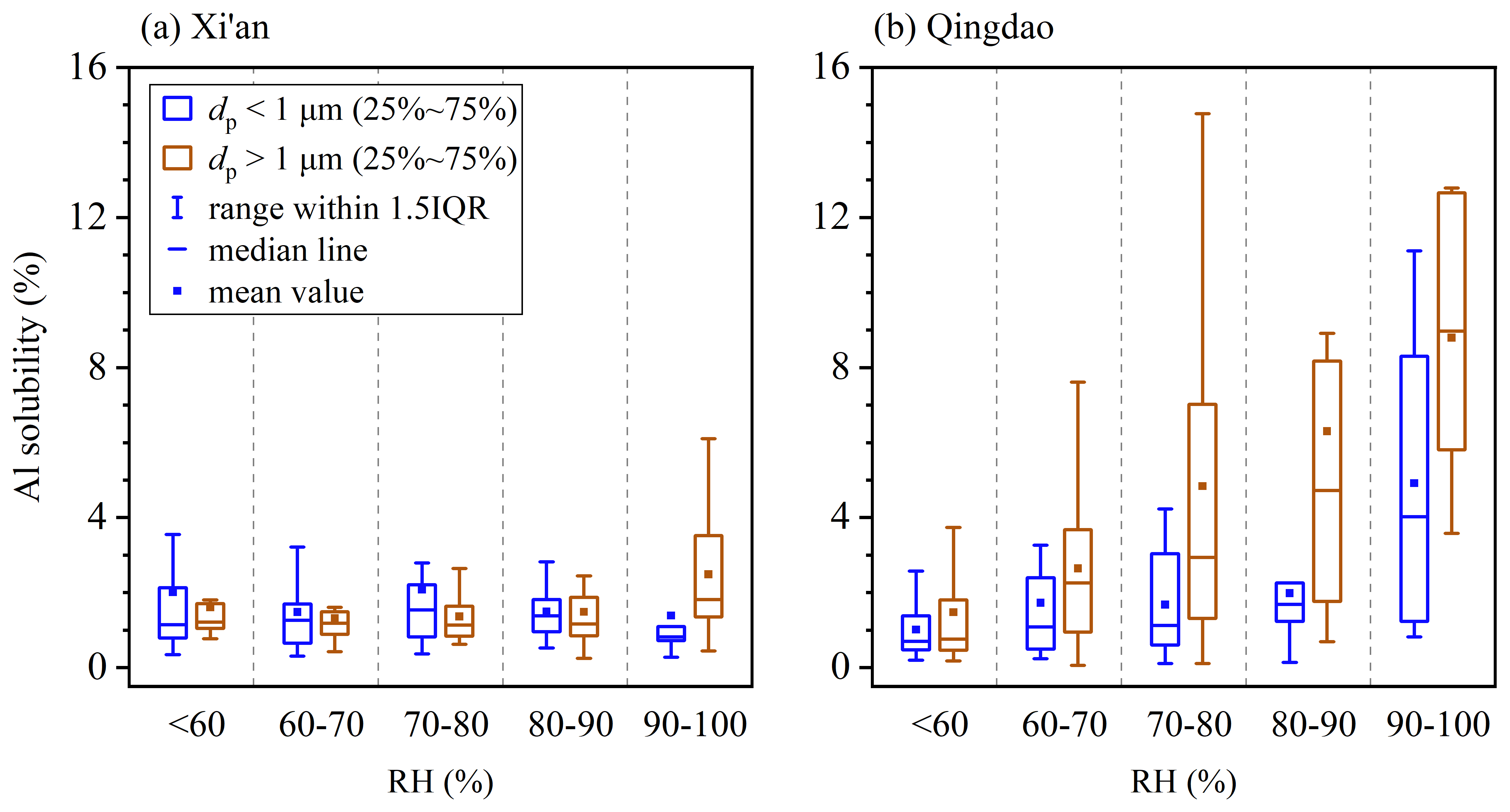 We observed no apparent variation of aerosol Al solubility with RH at Xi'an (Fig. 7a). When RH was <60 %, median Al solubilities for supermicron and submicron particles were 1.22 % and 1.14 %, respectively; when RH increased >90 %, the median Al solubilities were determined to be 1.82 % and 0.82 %, showing no obvious increase when compared to those at < 60 % RH. This again may imply that chemical processing had very limited impact on aerosol Al solubility at Xi'an, as mineral dust particles mostly remained externally mixed with secondary species and their aging extent was very limited (Wang et al., 2014; Wu et al., 2017).