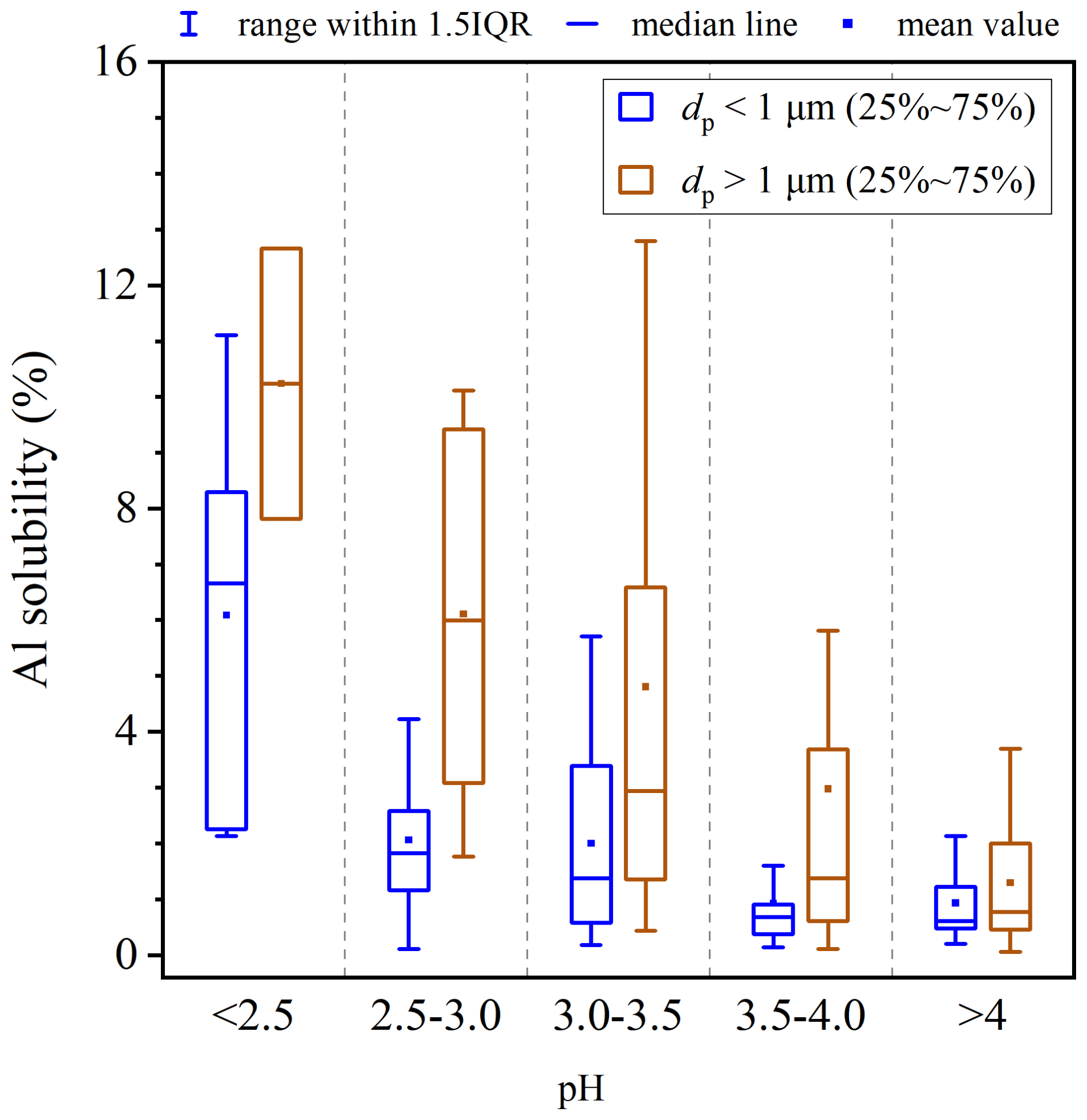 Figure 8 shows the dependence of aerosol Al solubility on aerosol acidity (represented by pH) at Qingdao (we did not measure NH3 at Xi'an and thus could not estimate the aerosol acidity in a reliable manner). For supermicron particles, the median Al solubility was only 0.99 % when aerosol pH was >4.0, and gradually increased to 10.24 % as aerosol pH was decreased to <2.5. For submicron particles, the median Al solubility was only 0.69 % when pH was >4.0, increased slightly with the decrease in pH when pH was in the range of 2.5–4.0, and then increased greatly to 6.09 % when pH was decreased to <2.5. In addition, aerosol acidity at Qingdao was highest in summer and lowest in spring (Chen et al., 2024), consistent with the seasonal variation of aerosol Al solubility, further supporting the importance of aerosol acidity in regulating Al solubility.