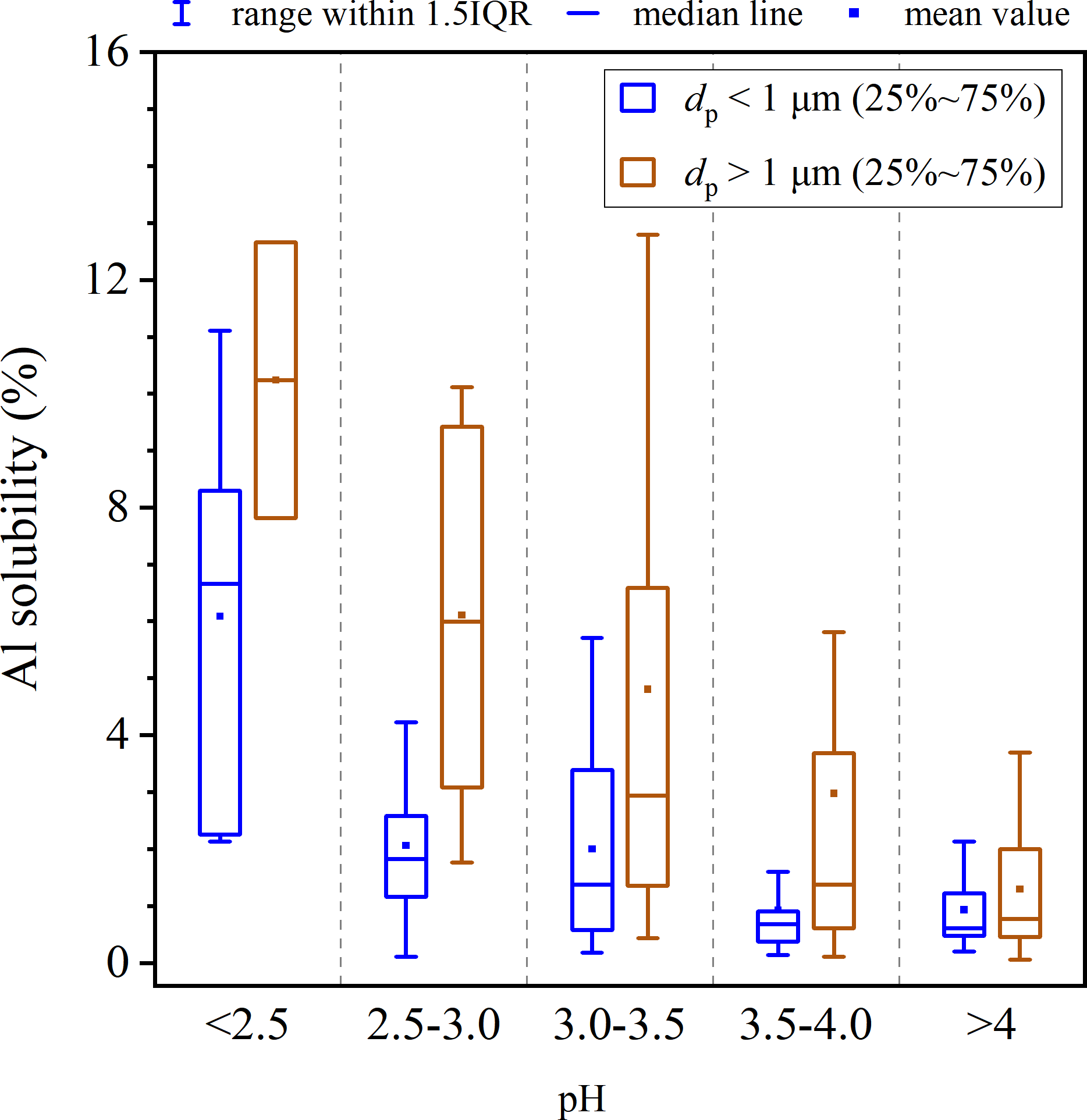 Figure 8Aerosol Al solubility corresponding to different aerosol acidity for submicron and supermicron particles in Qingdao.