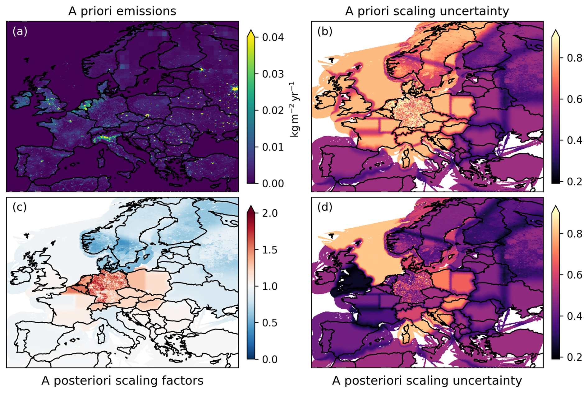 In our simulations we use modified Copernicus Atmosphere Monitoring Service information and ECCAD products for initial and lateral boundary conditions, and for a priori fluxes. We thank Stefan Feigenspan, Christian Mielke, Theo Wernicke, John Akubia and Roland Fuß for helpful discussions and providing a priori emission fields. We thank Roland Potthast, Frank-Thomas Koch, Christoph Gerbig, Dominik Brunner, Michael Steiner, David Ho, Thomas Kaminski, Hannes Imhof and our partners in the ITMS project for very helpful and inspiring discussions. We thank two anonymous reviewers for helping improve this manuscript. We also wish to thank Peter Bergamaschi, Aurélie Colomb, Martine De Mazière, Lukas Emmenegger, Dagmar Kubistin, Irene Lehner, Kari Lehtinen, Markus Leuenberger, Cathrine Lund Myhre, Michal V. Marek, Simon O'Doherty, Stephen M. Platt, Christian Plaß-Dülmer, Francesco Apadula, Sabrina Arnold, Pierre-Eric Blanc, Dominik Brunner, Huilin Chen, Lukasz Chmura, Łukasz Chmura, Sébastien Conil, Cédric Couret, Paolo Cristofanelli, Grant Forster, Arnoud Frumau, Christoph Gerbig, François Gheusi, Samuel Hammer, Laszlo Haszpra, Juha Hatakka, Michal Heliasz, Stephan Henne, Arjan Hensen, Antje Hoheisel, Tobias Kneuer, Eric Larmanou, Tuomas Laurila, Ari Leskinen, Ingeborg Levin, Matthias Lindauer, Morgan Lopez, Ivan Mammarella, Giovanni Manca, Andrew Manning, Damien Martin, Frank Meinhardt, Meelis Mölder, Jennifer Müller-Williams, Steffen Manfred Noe, Jarosław Nęcki, Mikaell Ottosson-Löfvenius, Carole Philippon, Joseph Pitt, Michel Ramonet, Pedro Rivas-Soriano, Bert Scheeren, Marcus Schumacher, Mahesh Kumar Sha, Gerard Spain, Martin Steinbacher, Lise Lotte Sørensen, Alex Vermeulen, Gabriela Vítková, Irène Xueref-Remy, Alcide di Sarra, Franz Conen, Victor Kazan, Yves-Alain Roulet, Tobias Biermann, Marc Delmotte, Daniela Heltai, Ove Hermansen, Kateřina Komínková, Olivier Laurent, Janne Levula, Chris Lunder, Per Marklund, Josep-Anton Morguí, Jean-Marc Pichon, Martina Schmidt, Damiano Sferlazzo, Paul Smith, Kieran Stanley, Pamela Trisolino and Giulia Zazzeri for providing the atmospheric observations. VB, DJCO, NB and AMB acknowledge funding by the German Federal Ministry for Education and Research (BMBF) in the ITMS project (grant no. 01LK2102B) as well as BE (grant no. 01LK2104A). Map plots were made with Natural Earth.