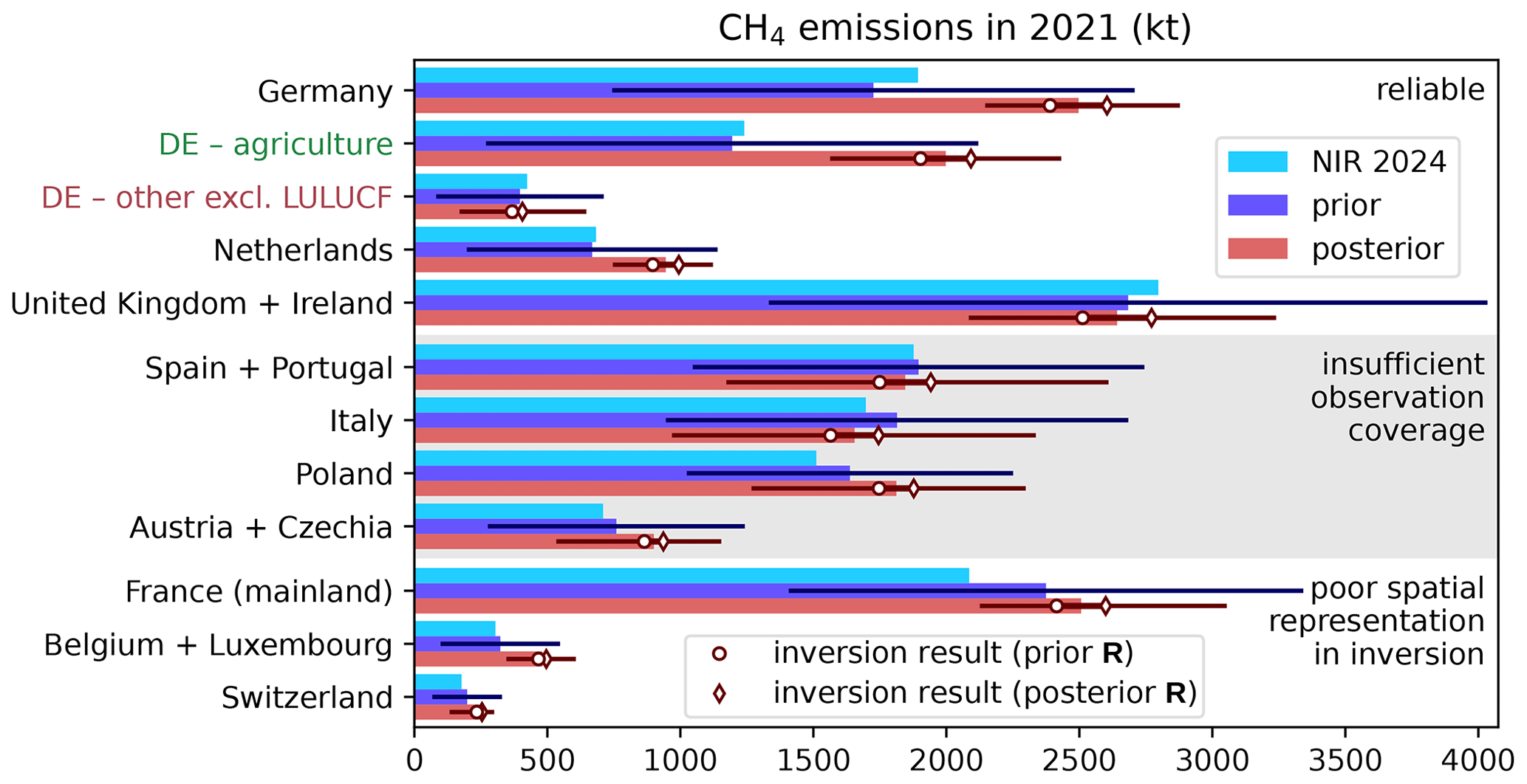 For a more detailed comparison of a priori and a posteriori emissions and uncertainties, we consider selected national emission estimates in Fig. 3. Reliable inversion results are expected for countries or regions with sufficient observation coverage, strong emission signals, representation in the respective flux categories, and only moderate issues due to complex topography. These criteria are met for Germany, the Netherlands and the United Kingdom plus Ireland as grouped in Fig. 3. For Germany (first entry in Fig. 3), the total posterior CH4 emissions (red bar) are (32±19) % higher than the anthropogenic emissions including LULUCF reported to the UNFCCC in 2024 (light blue bar). The direct comparison to the reporting neglects the unreported natural fluxes, but for Germany these are expected to be small because all relevant soil emissions are included in the LULUCF sector. The inversion significantly increases emission estimates from the agriculture sector while the combined other sectors remain nearly unchanged. Note, however, that the uncertainty in the sector attribution is large (horizontal lines, see further discussion in Sects. 3.4.2 and 4.3).