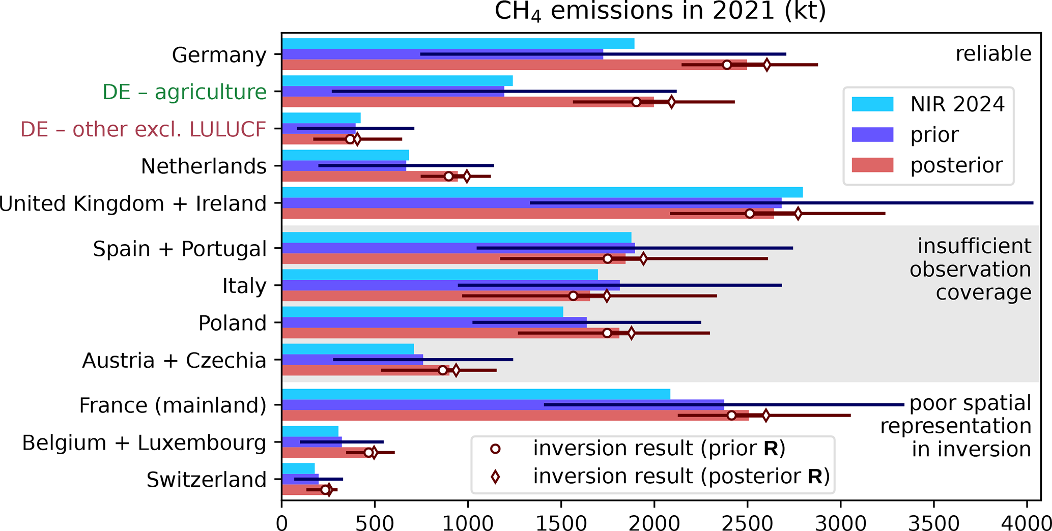 Our inversion system combines precise in situ observations, accurate a priori fluxes from national reporting, the ICON–ART transport model at 6.5 km resolution, and an ensemble-estimated transport uncertainty. We further rely on CAMS boundary conditions and high-resolution meteorological fields from operational numerical weather prediction. This yields in general a good agreement between the model prediction and filtered observations, allowing us robust emission estimates for well-observed countries, such as Germany. We compare top-down CH4 emission estimates to the reported German inventory and its agriculture sector with enough accuracy to lay the technical foundations for a future long-term observation-based national inventory verification. This section discusses our main results (Sect. 4.1), including a comparison with other studies (Sect. 4.2). We elaborate the limitations of our approach (Sect. 4.3) and its potential for the development of observation-based national inventory verification to inform climate policy (Sect. 4.4).