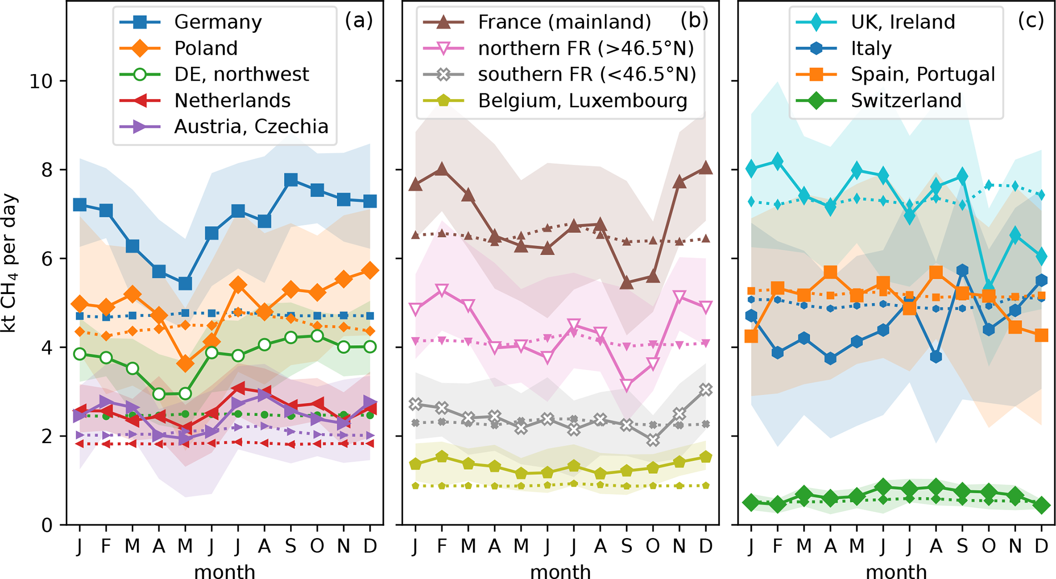 Figure 4Monthly posterior emission rates for selected countries or regions. Colored areas show the posterior uncertainties, and dotted lines with small markers indicate prior emission rates. In the prior, only the natural and LULUCF fluxes are time-dependent. The panels show (a) countries with minimum in May, (b) countries with a maximum in winter, and (c) other countries and regions. For France and Germany, selected regions are shown additionally (white markers). “DE, northwest” includes Rhineland-Palatinate, Saarland, Hesse, North Rhine-Westphalia, Lower Saxony, Schleswig-Holstein, Bremen and Hamburg.