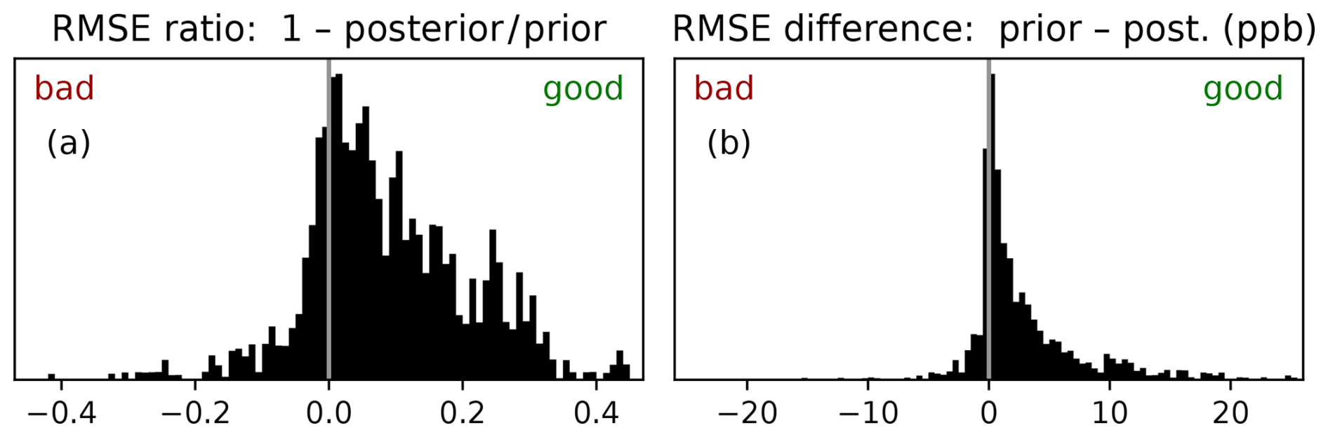 Figure 5Statistics of the relative (a) and absolute (b) improvement of the model–observation mismatch by the inversion at independent validation stations. Each station and month is considered separately in its own inversion, with the validation station excluded from the inversion to remain independent. The histograms show (a) 1-rpost/rprior and (b) rpriorrpost where rpost and rprior refer to the RMSE of the model–observation comparison in the case of posterior scaling and prior scaling, respectively. Each time series contributing to the histogram is weighted by the number of its data points. We consider all data points within the daily time window without filtering for wind speed or model–observation mismatch and without the far-field correction introduced in Part 1 (Bruch et al.2025a) to keep the comparison as close as possible to the original data. Positive values indicate an improvement in the model prediction due to the inversion.