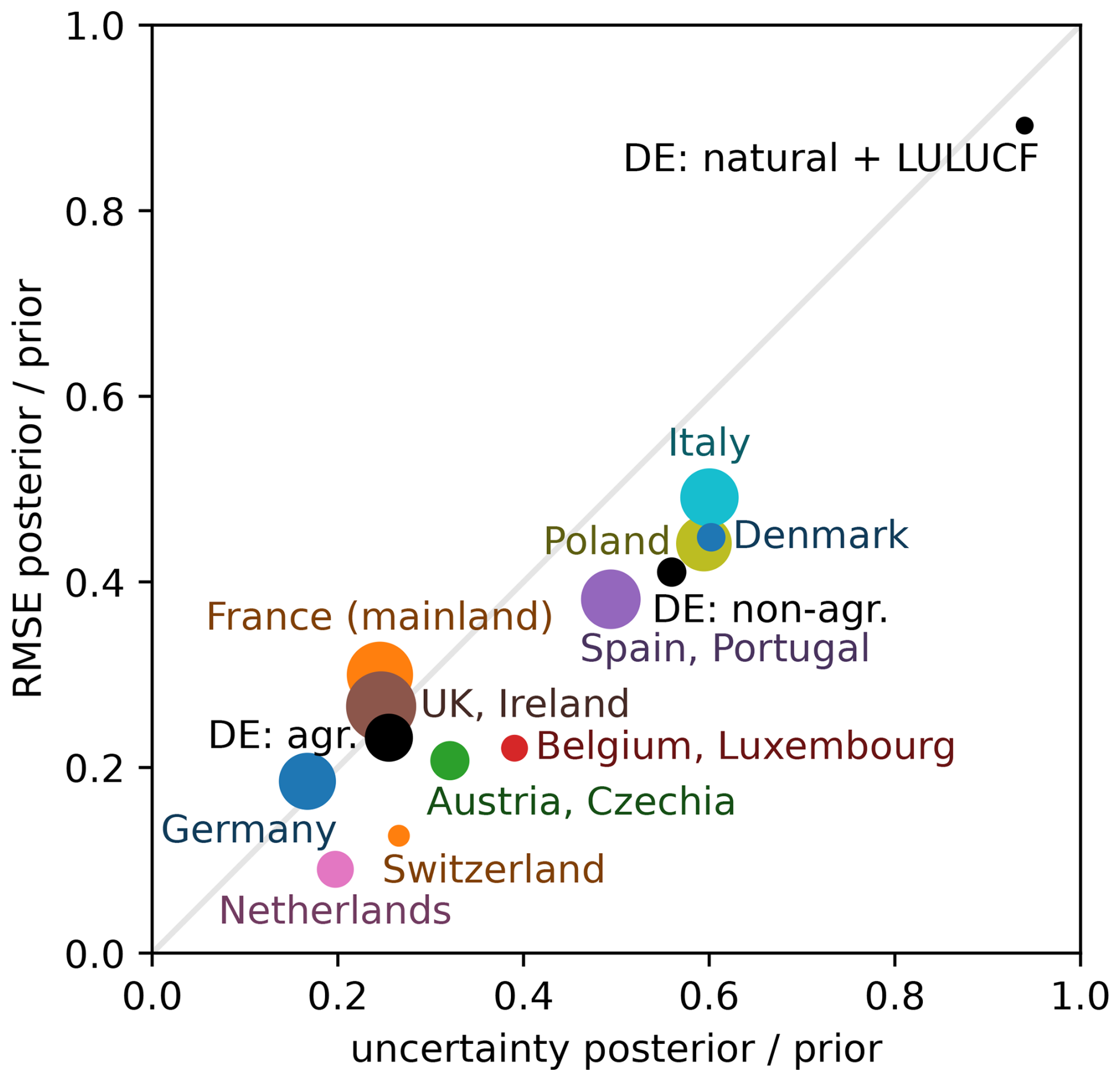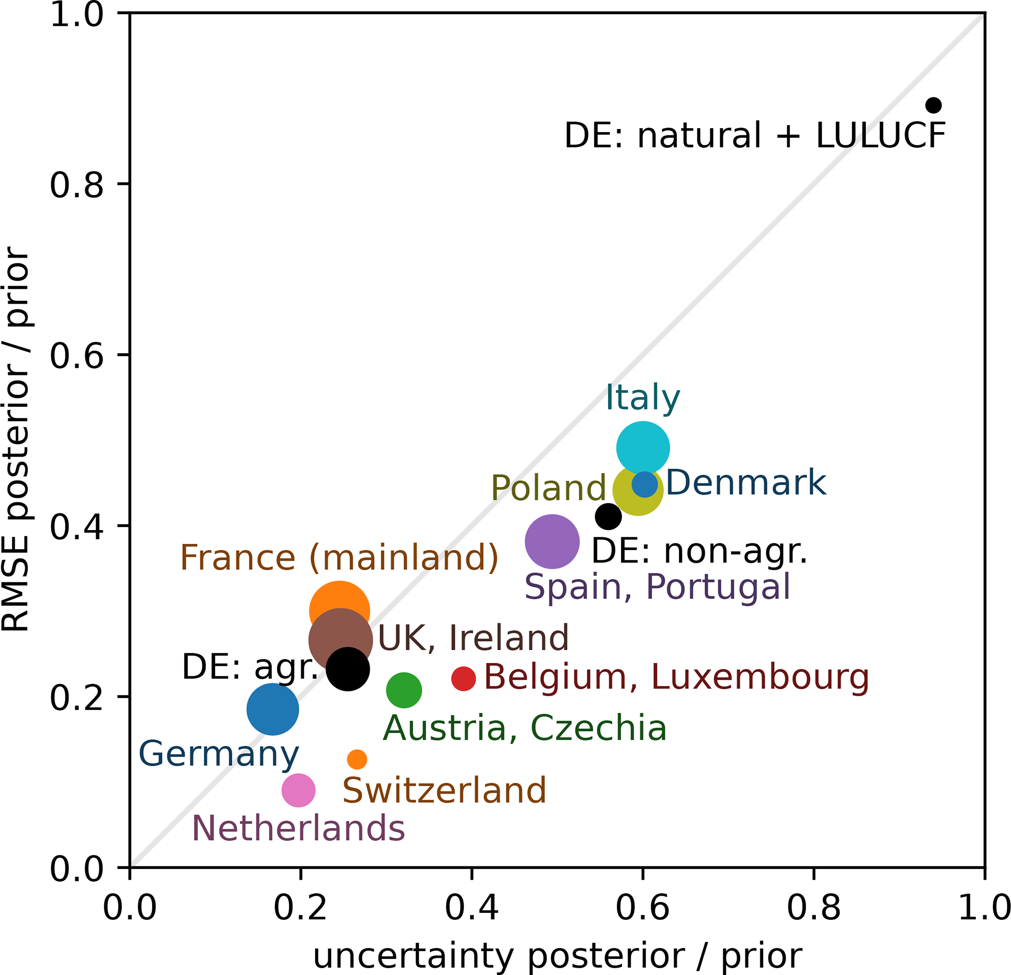 Figure 6RMSE and mean uncertainty of CH4 emission estimates in synthetic experiments for selected countries, regions, and German emission sectors. Each of the 100 synthetic experiments uses random true emissions. The vertical axis shows the root mean square (RMS) deviation of the posterior from these true emissions, relative to the RMS deviation of the prior from the truth. Lower values indicate that the inversion improves the emission estimate. The horizontal axis shows the posterior uncertainty relative to the prior uncertainty. Therefore, the bottom left indicates best performance. The disk size indicates the magnitude of the prior emissions.