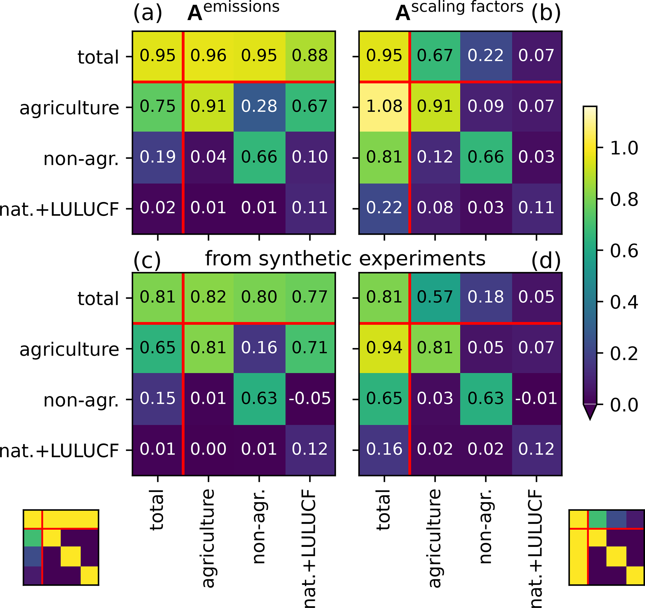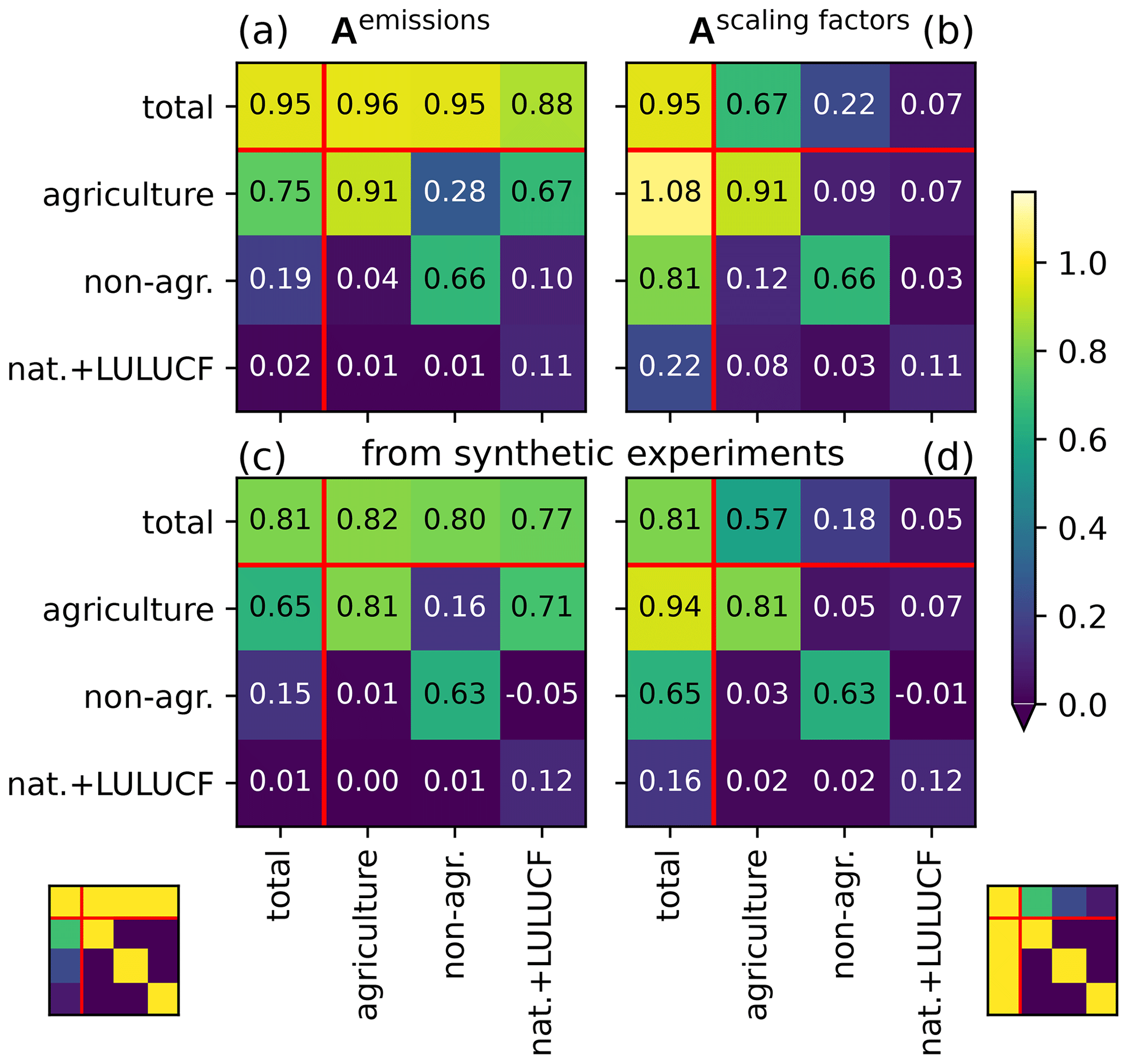 Figure 7Averaging kernel matrices of German sector emissions (a, c) and scaling factors (b, d). The kernel is estimated using either the posterior covariance matrix (a, b) or 100 synthetic experiments with random truth (c, d). The small matrices on the bottom indicate what we aim for (posterior equals truth). The value 0.96 in the first row (“total”), second column (“agriculture”) of panel (a) means that if in reality all German agriculture emissions were 1 kt higher than in our prior, then we would expect an increase in the posterior total German emissions by 0.96 kt. Similarly, the value 0.67 in the same cell of panel (b) means that increasing real agriculture emissions by 10 % should increase our posterior total emissions by 6.7 %. All matrices are averaged over the whole year. Red lines separate the individual sectors from their sum (“total”). By “non-agr.” we denote anthropogenic emissions excluding agriculture and LULUCF.