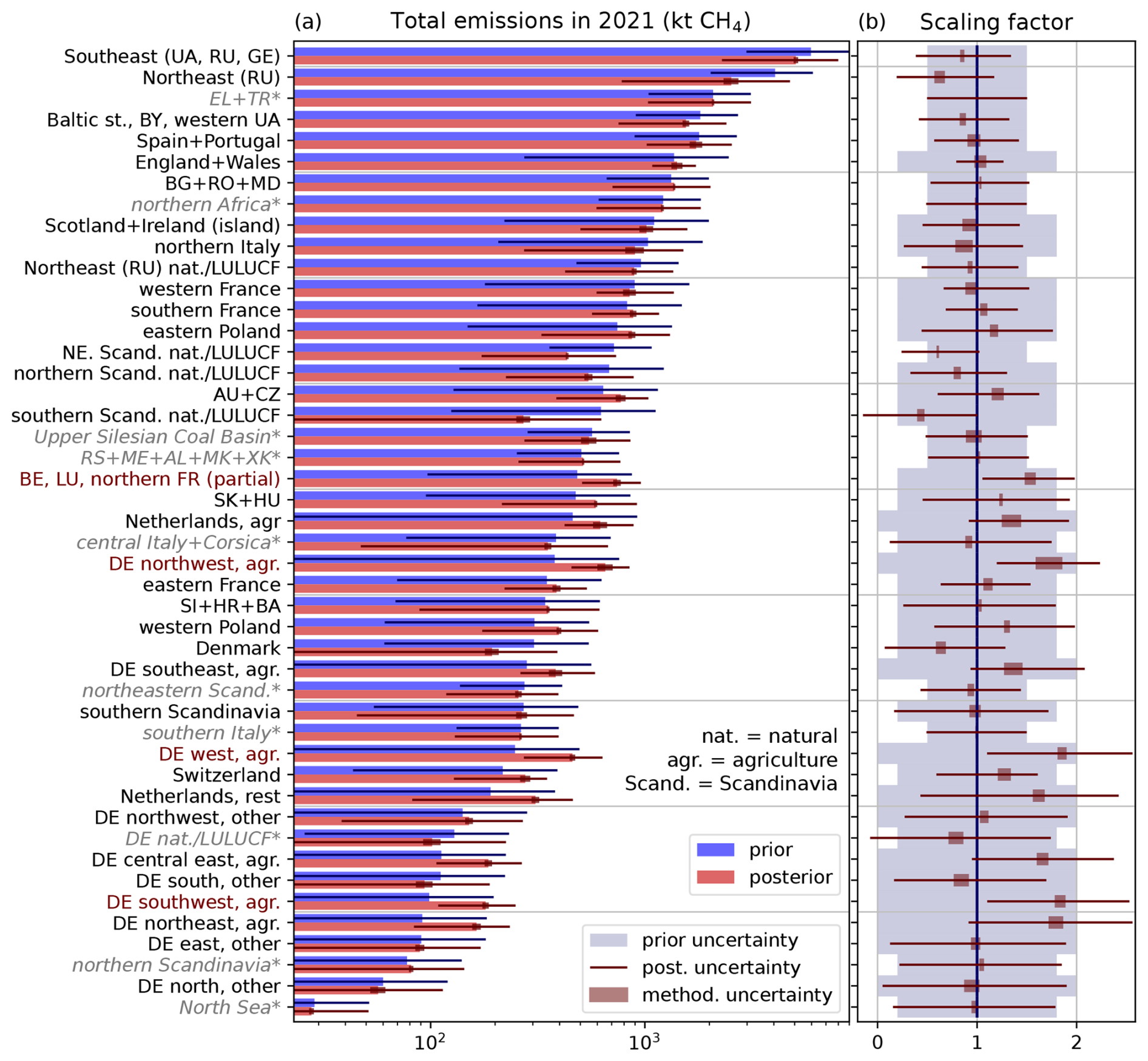 In most countries, the observations do not cover the whole country, or the inversion results rely on few observations. In Fig. 3 (gray-shaded part) we provide emission estimates also for countries or regions affected by this issue, though these have a large posterior uncertainty. Another issue arises from the definition of the flux categories, which do not necessarily follow country borders (see Fig. 1). In France, Belgium, and Switzerland, the inversion scales flux categories that overlap multiple countries1. This implies that national emission estimates derived for these countries have an additional uncertainty and artificial correlations with neighboring countries. However, this is of no concern for our application for Germany. The national emission estimates are computed from the gridded posterior fluxes and precisely follow the country borders as shown in Fig. 2. The scaling factors and uncertainties of all flux categories are listed in Fig. A1 for completeness.