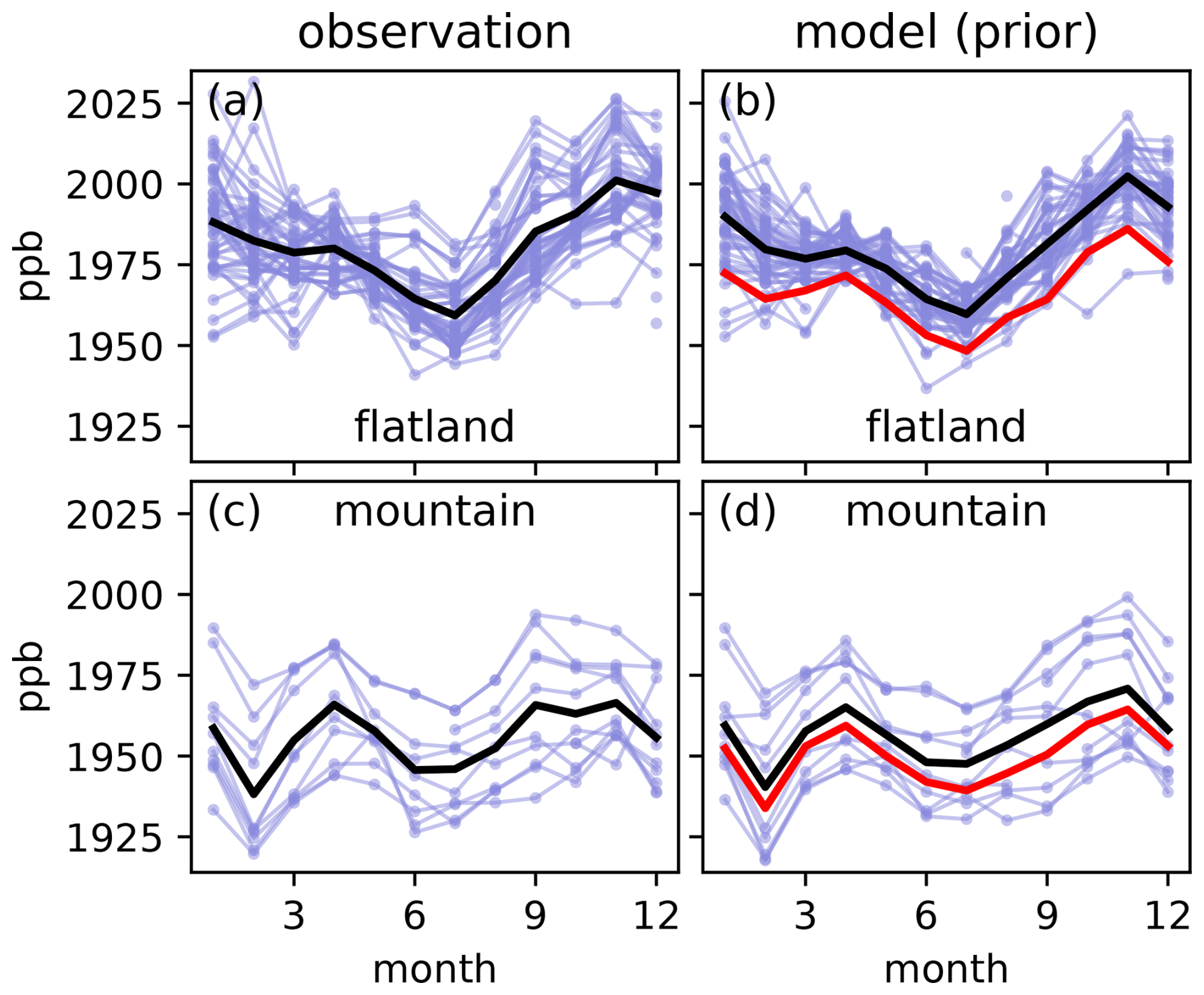 Figure A3Seasonal cycle in observations at stations with elevation below 500 m above sea level (a, b) and above 1000 m (c, d), supplementary to the discussion in Sect. 3.2. Thin blue lines represent the 10 % quantile of each month, station, and sampling height for (a, c) observations and (b, d) model predictions (prior). The 10 % quantile is chosen to minimize the effect of local pollution. Thick black lines indicate the mean of all selected stations and sampling heights. Thick red lines in (b) and (d) show the 10 % quantile of the modeled far-field concentration. The flatland stations show a pronounced seasonal cycle with minimum in summer for both model and observations. This cycle is dominated by the contribution of the far field. The mountain stations have a weaker seasonal cycle.