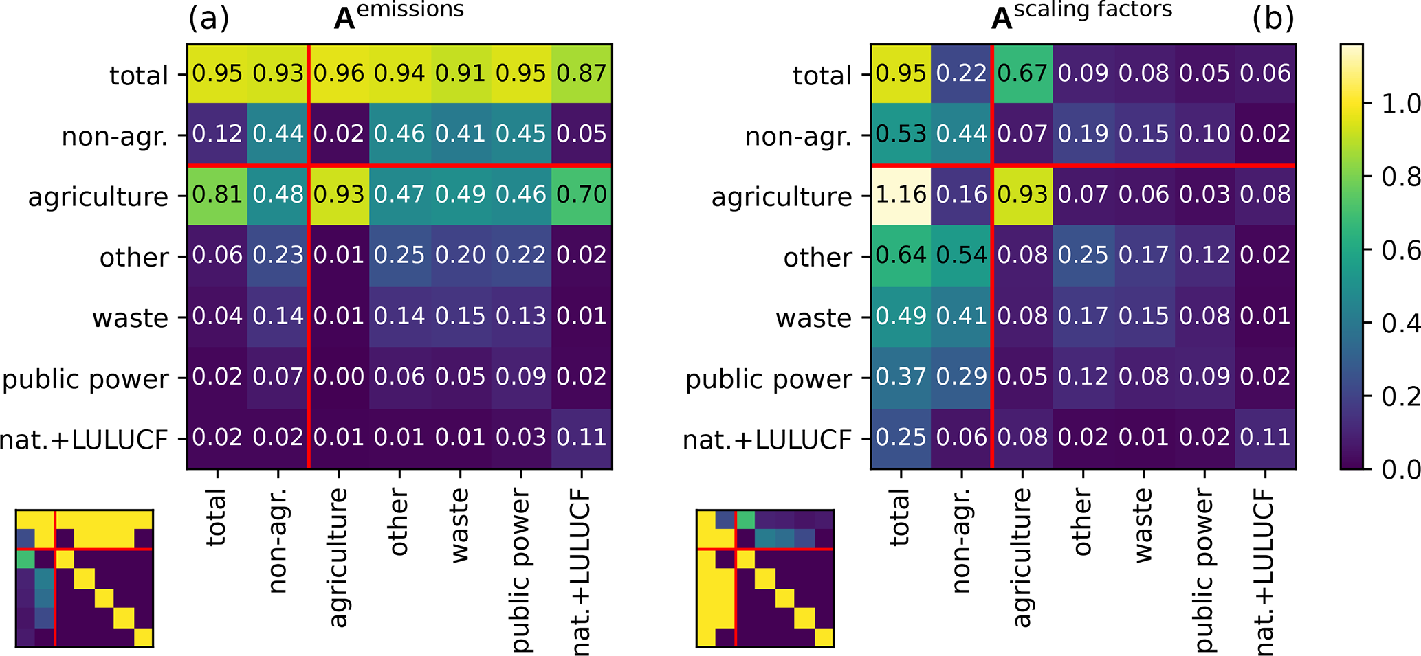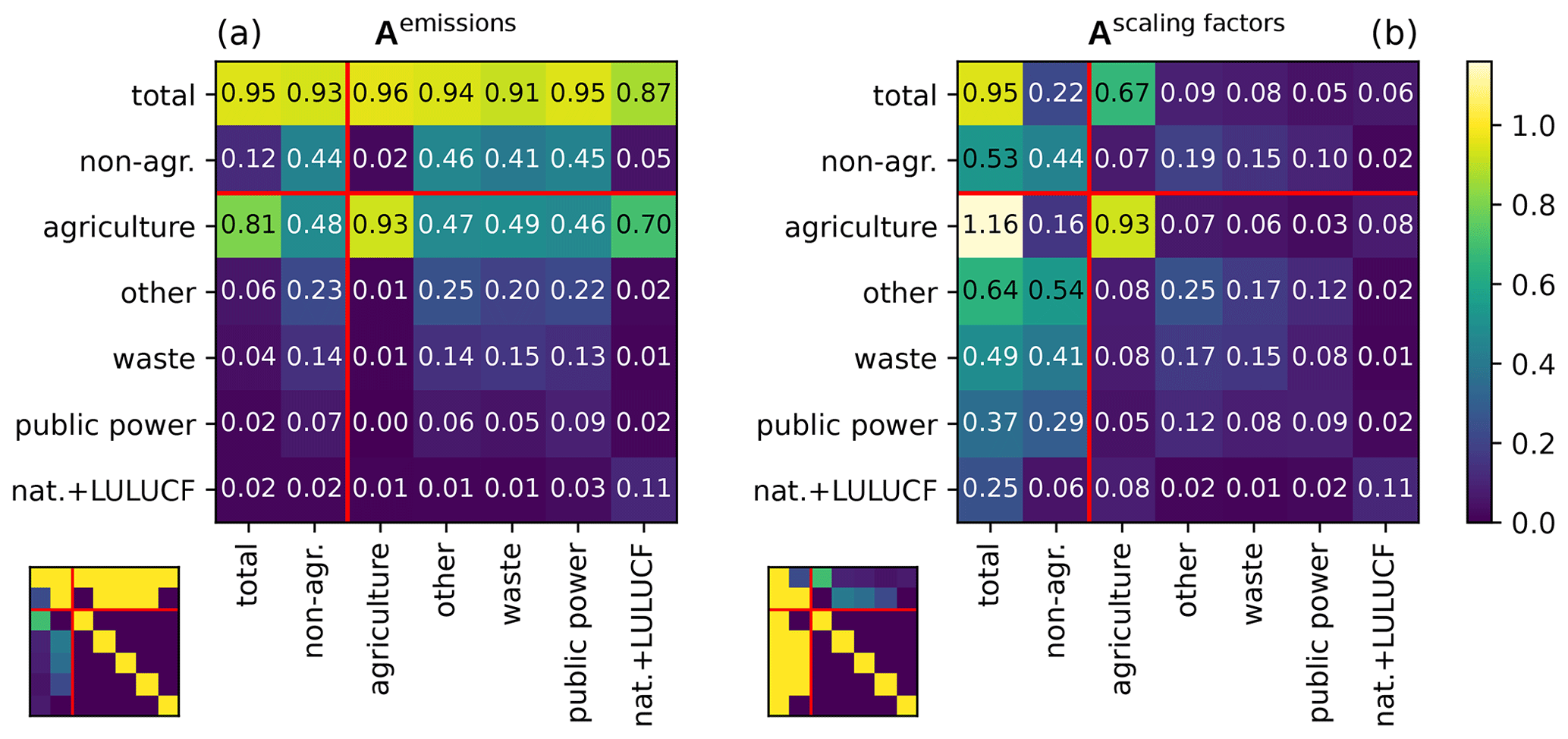 The first row of Fig. 7a indicates that the total German posterior emissions follow changes in every sector with high accuracy (88 % to 96 %). The diagonal of Fig. 7a signifies that changes in the agriculture will be detected very well and also the attribution to the sum of all other anthropogenic sectors excluding LULUCF (“non-agr.”) will be mostly correct. However, LULUCF plus natural fluxes will in large parts be falsely attributed to the agriculture (second row, last column). Note that ideally, the first row and the diagonal elements would be close to 100 % (color-coded in the small matrix bottom left). The averaging kernel Ascaling factors in Fig. 7b shows that the influence of LULUCF and natural emissions on the posterior scaling factor for agriculture emissions remains low (second row, last column). But if all emissions are scaled by the same factor (first column), the changes will be mostly attributed to the agriculture sector. This effect is expected because the agriculture sector has the highest absolute a priori uncertainty, which makes changes in agriculture more likely than changes in any other sector. A formal derivation of this argument is presented in Appendix C.