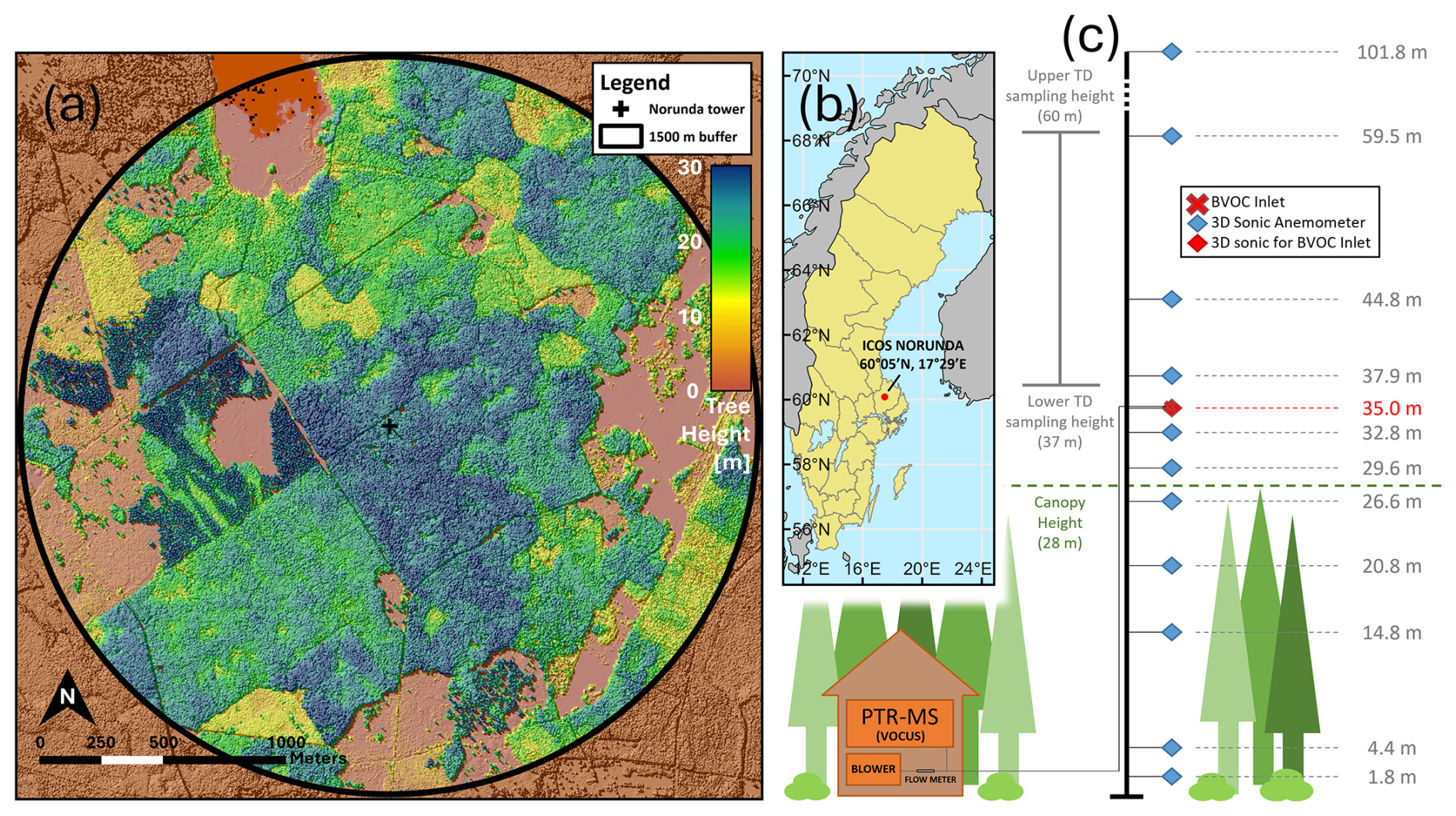Figure 1Forest map, station location, and BVOC inlet setup for ICOS Norunda. (a) A map of tree heights surrounding the station flux tower (out to 1500 m radially from tower base) for the Norunda forest. (b) Location and coordinates of ICOS station Norunda in Sweden. (c) BVOC inlet, infrastructure, and instrumentation setup for Vocus PTR-ToF-MS measurements on the Norunda tower (BVOC inlet at 35 m). Shown are the heights of the on-site collection of 3D sonic anemometers (blue diamonds) and BVOC inlet (red cross) at the station flux tower. The canopy top height was at approximately 28 m. Sonic-profile anemometers were located at 1.8, 4.4, 14.8, 20.8, 26.6, 29.6, 32.8, 35, 37.9, 44.8, 59.5, 74,88.5, and 101.8 m on the Norunda tower. The instrument shed contained the Vocus PTR-ToF-MS and zero-air generator for the Vocus. A blower was used to pull air through the tower inlet.