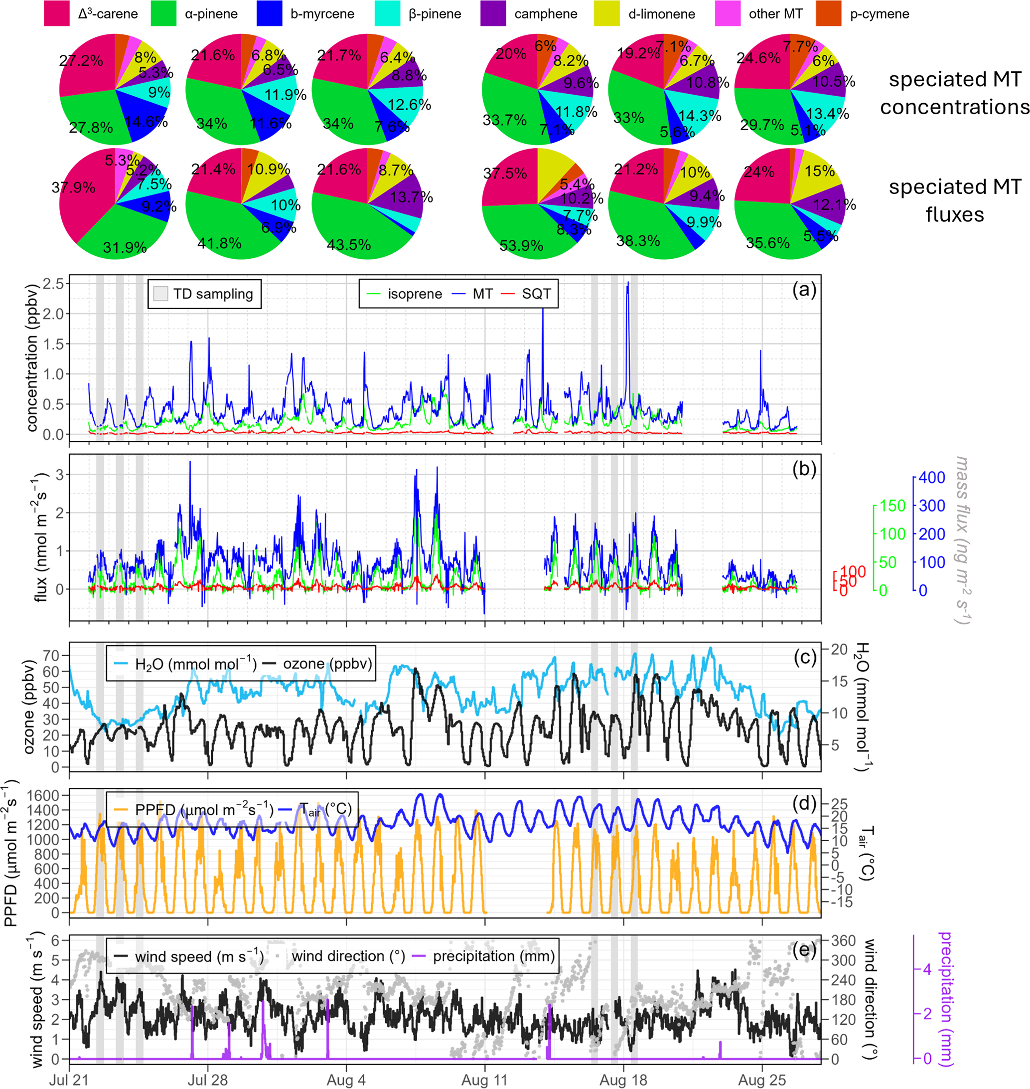 Figure 2The 30 min BVOC concentrations (ppbv) and fluxes (nmol m−2 s−1) sampled at the 35 m BVOC inlet at ICOS Norunda, as well as related meteorological measurements. Shaded areas depict manual TD BVOC sampling periods at 37 and 60 m on the Norunda flux tower. The pie charts indicate the relative speciation of MT compound (top row) concentrations at 37 m and (bottom row) fluxes (via SLG flux method) as determined from the TD BVOC samples (percentages shown are >5 %). (a) MT, isoprene, and SQT concentrations (ppbv) and (b) EC-derived fluxes (nmol m−2 s−1) from the Vocus PTR-ToF-MS. The equivalent mass-flux (ng m−2 s−1) for isoprene, MT, and SQT is depicted along the right-hand y-axis. (c) Ozone concentration (ppbv) and water vapor (mmol mol−1). (d) PPFD (µmol m−2 s−1; at height 55 m) and air temperature (°C; at 37 m). (e) wind speed (m s−1), wind direction (°), and precipitation (mm). Set of displayed measurements span from 21 July to 27 August 2020.