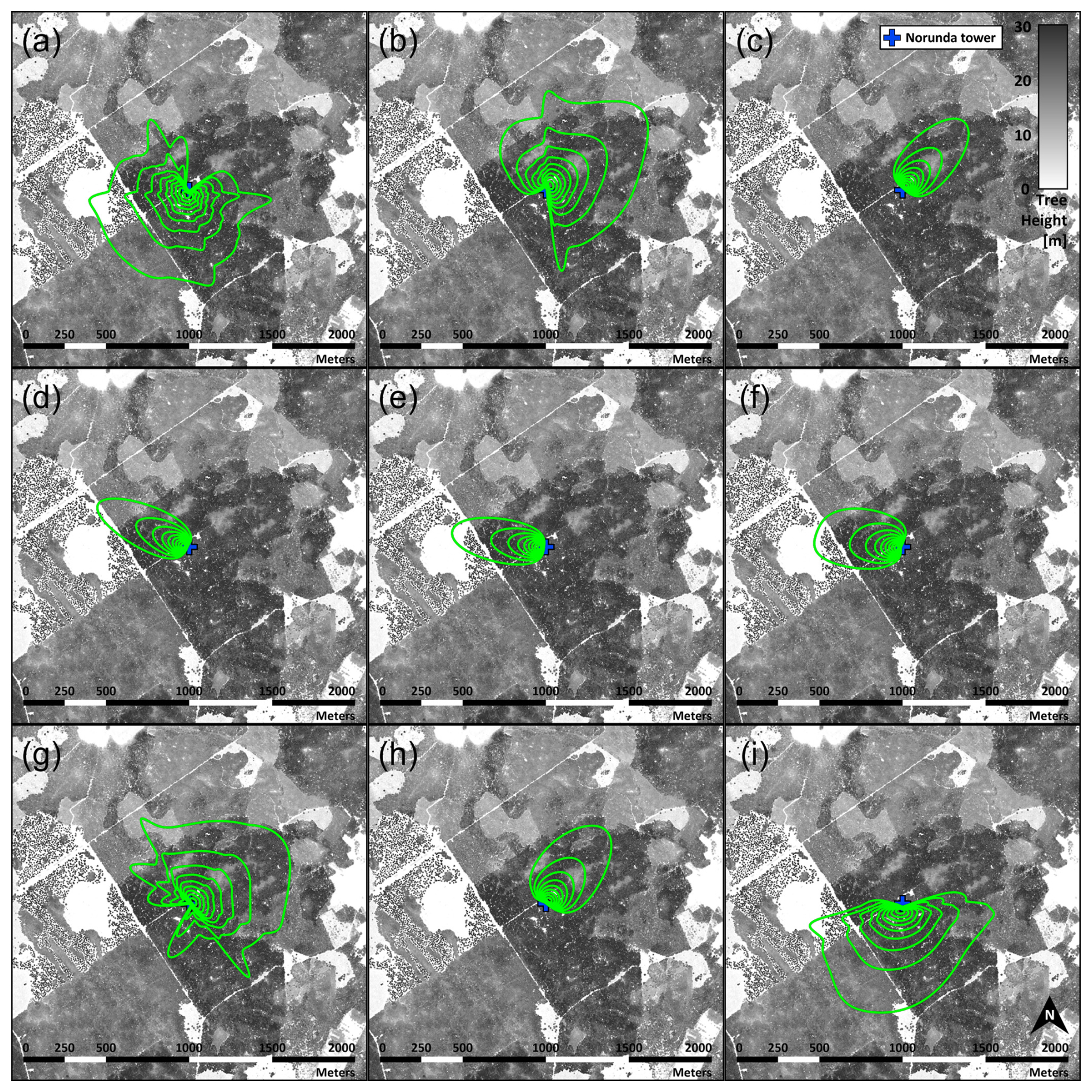 Figure 3Daytime (from 09:00 to 17:00 CEST) average footprint estimates for SLG-derived fluxes using the two TD BVOC sampling heights (37 and 60 m) on the Norunda flux tower. Footprint contour lines (green) are shown in 10 % increments from 10 % to 90 %. Displayed footprints assessed at geometric-mean height (47.1 m) of TD sampling levels, following Horst (1999) for footprint estimation of SLG-method surface fluxes under unstable atmospheric stratification above-canopy (see Fig. 5f). The panels show these footprints for (a–c) 8, 9 and 10 June, (d–f) 22, 23, and 24 July and (g–f) 16, 17, and 18 August respectively.