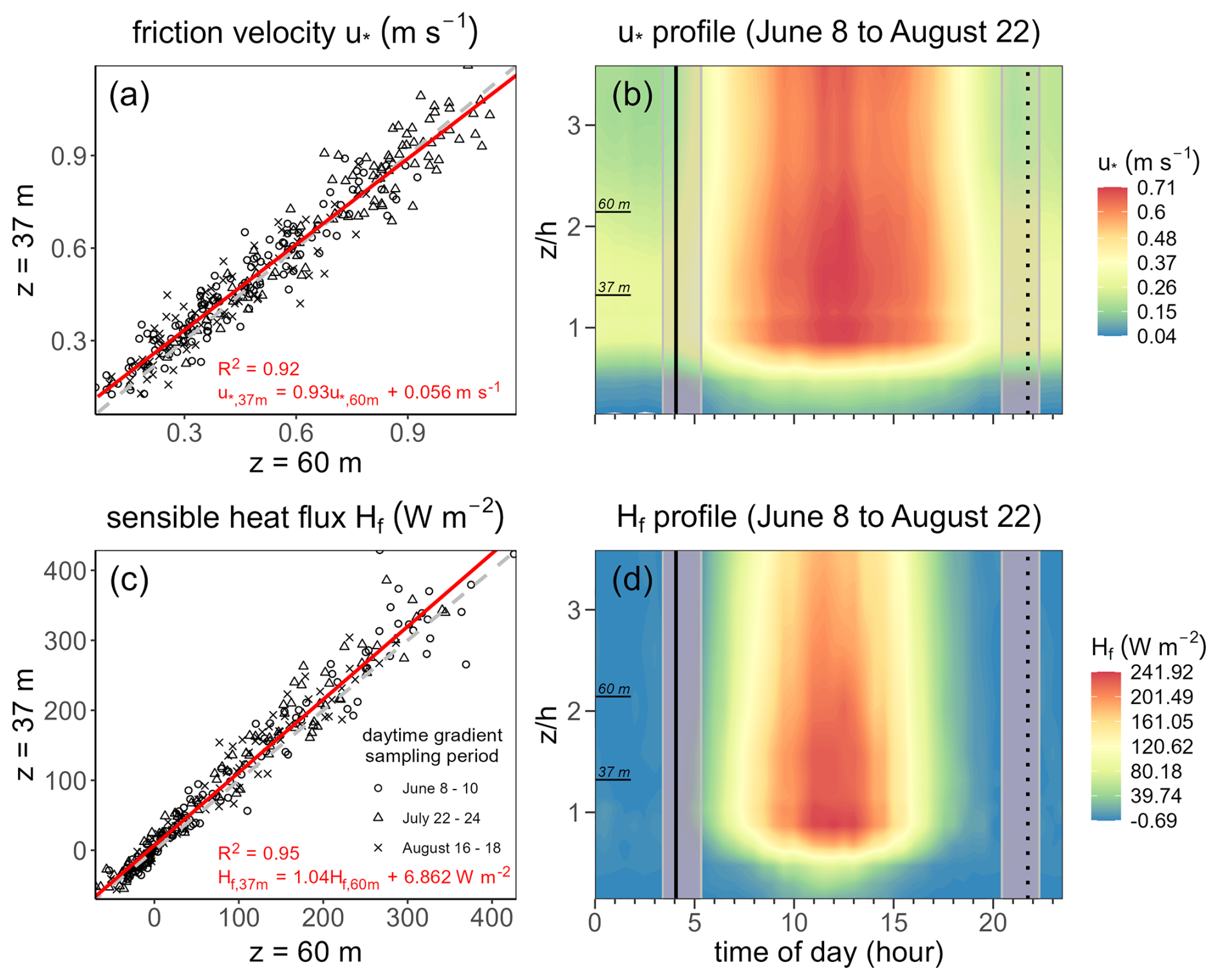 Figure 4Comparison between friction velocity u∗ (m s−1) and sensible heat flux Hf (W m−2) measured at two heights above the forest canopy. (a, c) A best-fit comparison between 37 and 60 m for (a) friction velocity and (c) sensible heat flux during the 3 d sampling periods in June, July and August. The dashed line indicates a 1:1 relation, while the solid red line indicates the best fit linear regression. (b, d) Diurnal mean contour profiles for the 2020 Norunda campaign of (b) friction velocity u∗ and (d) Hf with respect to the normalized height (canopy height h=28 m) in and above the Norunda forest. The relative heights of the 37 and 60 m sampling levels on the normalized height scale are indicated on the y-axis. In (b) and (d) panels, mean daily sunrise (solid vertical line) and sunset (dotted vertical line) are indicated. Shaded region indicates the range of sunrise and sunset times during the 9 June to 22 August campaign period.