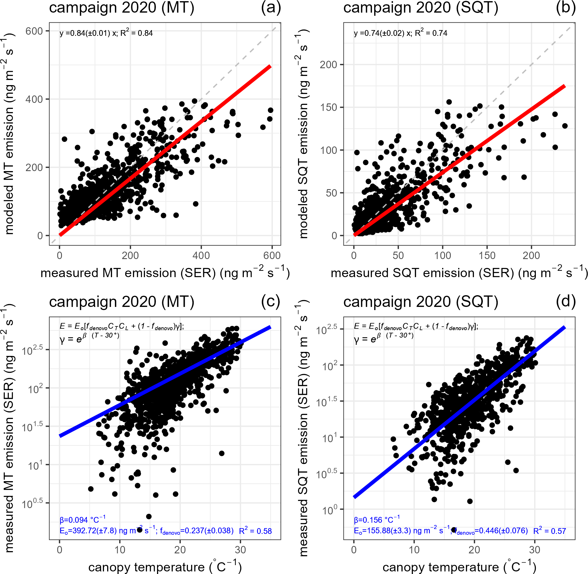 Figure 8Hybrid emission algorithm comparison to terpene measurements. (a, b) Comparison of measured vs. modeled emission (using the fitted coefficients) for (a) MT and (b) SQT SERs. The red line indicates the linear regression best-fit line for the data points, and dashed gray line indicates the one-to-one line. (c, d) Plots of the canopy temperature vs. (c) MT emission and (d) SQT emission. Blue line shows the best-fit regression line.