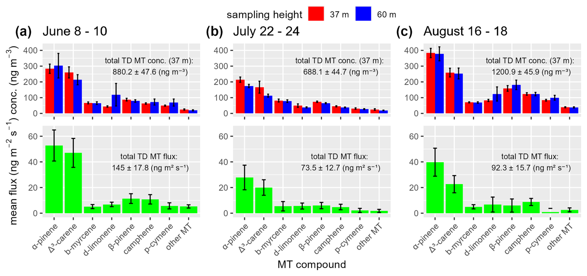 Figure 9Monthly sampling-period mean concentrations of MT compound species at 37 (red) and 60 m (blue) on the station flux tower at the ICOS Norunda boreal forest, as well as sampling period mean speciated MT fluxes (green), during 8–10 June (a), 22–24 July (b) and 16–18 August (c). Vertical error bars indicate the standard mean error. The daily mean concentrations and fluxes are shown in Fig. C1 in Appendix C.