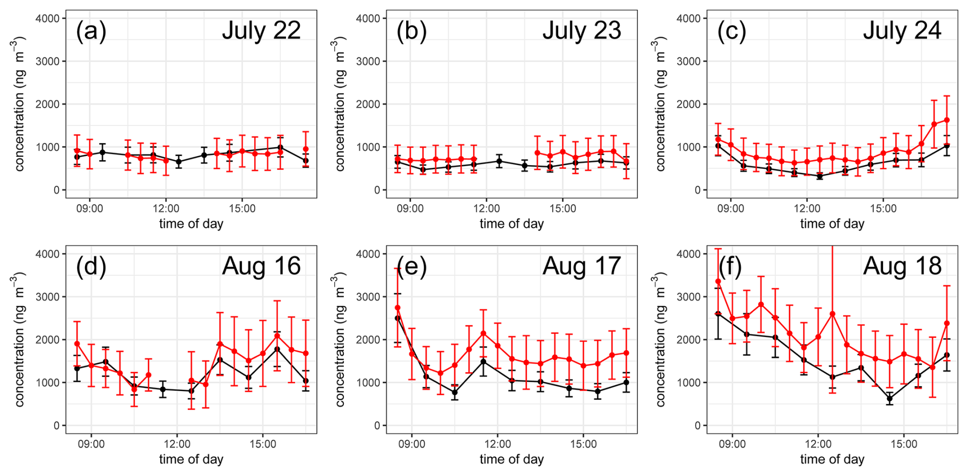 Figure 10Comparison of MT concentration measurements from the Vocus PTR-ToF-MS (red) and the sum of speciated MT concentrations (black) from the TD sample GC-MS analysis. Summed TD MT displayed were measured at the 37 m TD sampling height. Error bars indicate (red) standard deviation of 30 min Vocus MT concentration and (black) uncertainty of summed TD MT concentrations based on the error analysis for TD sampling and analysis presented in Sect. 2.7. Shown are half-hourly time series of the MT concentration measurements from both Vocus and manual TD sampling for the (a–c) 22–24 July 2020 and (d–f) 16–18 August 2020 TD sample periods.