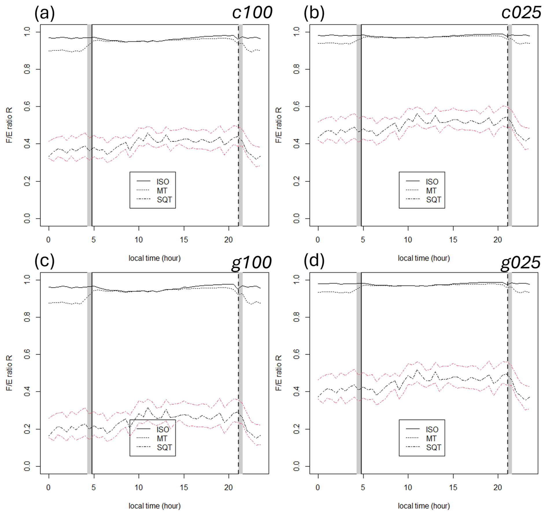 Figure 7Mean diurnal SERs for isoprene, MT, and SQT during the 2020 Norunda campaign. Shaded region indicates the range of uncertainty for the modeled ozone, OH, and NO3 reaction rate coefficients. Dashed black line indicates the corresponding measured flux.