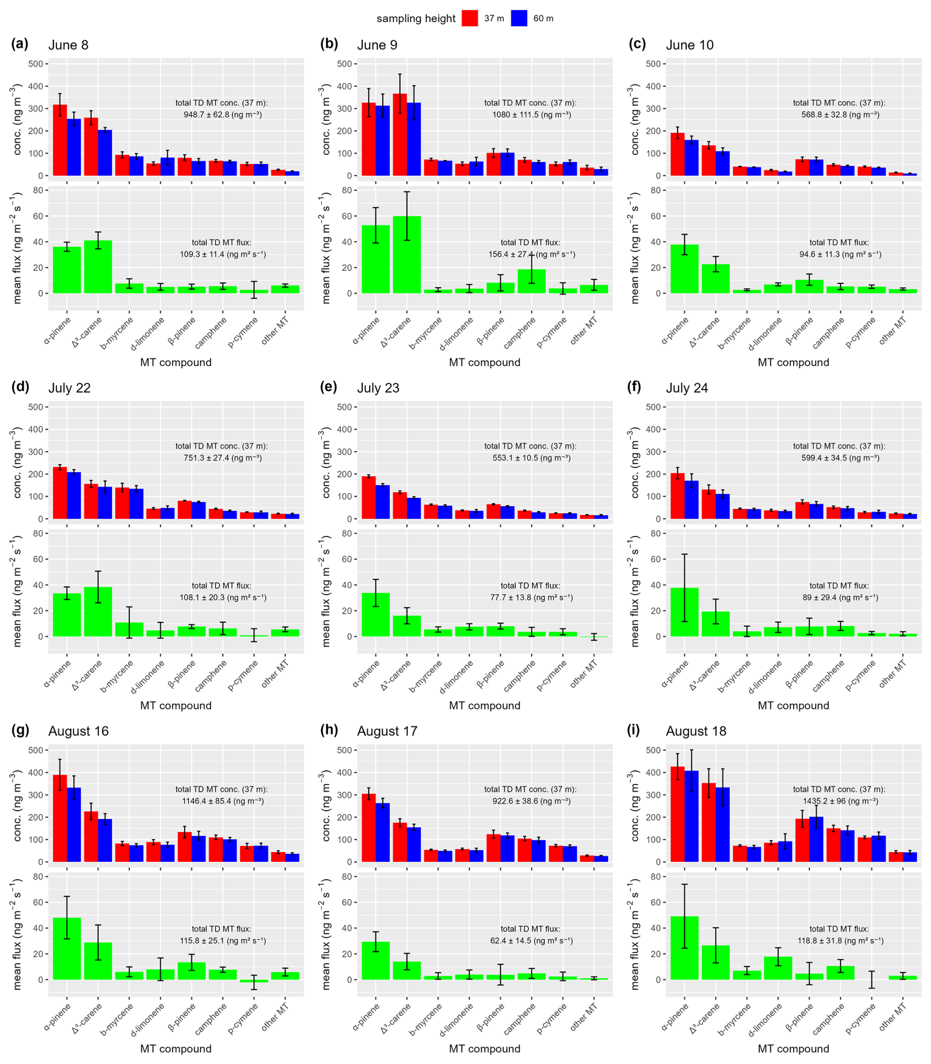 During the campaign, α-pinene, Δ3-carene, β-pinene, camphene, myrcene, and limonene were detected in the ATD-GC–MS analysis. The most abundant MT species throughout the campaign was α-pinene, followed by Δ3-carene (see Figs. 2 and 9). Limonene concentrations contributed approximately 5 %–10 % of total MT concentrations. An overview of the monthly sampling-period mean concentrations and SLG method-derived fluxes of the speciated MT compounds, observed via thermal desorption sampling at 35 m above the forest canopy, during the 3 d monthly sampling periods in June, July, and August is shown in Fig. 9. A daily mean evaluation can be found in the Appendix. During all sampling periods, α-pinene was the most prevalent MT compound present, fairly constant and typically representing between ca. 28 % to 34 % of the total MT concentration. The second most prevalent MT compound was Δ3-carene. From June to August, fraction of Δ3-carene among the MT compounds decreases by ca. 8 %, from monthly sampling-period averages of ca. 30 % in June, to ca. 24 % in July and ca. 22 % in August. During the June measurements, the typical concentration abundance at 37 m above the forest canopy among the MT species were 32 (± 4) % α-pinene, 30 (± 4) % Δ3-carene, 7.6 (± 0.8) % myrcene, 5 (± 0.6) % limonene, and 10 (± 1.1) % β-pinene, 7.2 (± 0.6) % camphene, and 5.6 (± 0.5) % cymene. In July, the typical abundances were 31 (± 3) % α-pinene, 24 (± 6) % Δ3-carene, 12 (± 2) % myrcene, 7(± 2) % limonene, and 10.8 (± 0.9) % β-pinene, 4.5 (± 0.7) % camphene, and 4.5 (± 0.7) % cymene. In August, the typical abundances were 32 (± 3) % α-pinene, 22 (± 2) % Δ3-carene, 5.9(± 0.4) % myrcene, 6.9 (± 0.6) % limonene, 13 (± 2) % β-pinene, 10.3 (± 0.8) % camphene, and 7 (± 0.5) % cymene.