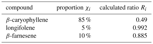 The effect of chemical degradation on isoprene, MT, and SQT SERs was explored using the modeling work of Rinne et al. (2012), which made use of a stochastic Lagrangian transport chemistry model, and by parameterizing the diurnal cycle of the reaction rates for ozone, OH, and NO3, to estimate the SERs for the 2020 Norunda campaign's terpenoid EC flux dataset. The OH, O3, and NO3 reaction rate constants of isoprene, MT, and SQT for the chemical degradation analysis are from those reported by Atkinson (1997) and Shu and Atkinson (1995). In Sect. 3.3.1, the reaction rate coefficients of α-pinene and β-caryophyllene were implemented to assess SERs from the measured fluxes of total MT and total SQT, respectively, obtained using Vocus PTR-ToF-MS. Both compounds are common and frequently dominant examples of their terpenoid classes in the emissions of Norunda and similar boreal forests (e.g., Hakola et al., 2006; Hellén et al., 2018; Rinne et al., 2009; Rinne et al., 2012; Wang et al., 2018).” It is important to note, however, that the dominance of a particular compound in total emissions, such as β-caryophyllene among SQTs, might not always be the case, particularly for non-constitutive (stressed) emissions, such as from insect herbivory (e.g., Wang et al., 2017). Care must be taken when inferring total SERs that underlying assumptions regarding the relative mixture of emitted compounds are correct. A full description of the SER calculations, as well as the influence of relative speciation on total exchange rate estimate uncertainties, can be found in the Appendix.