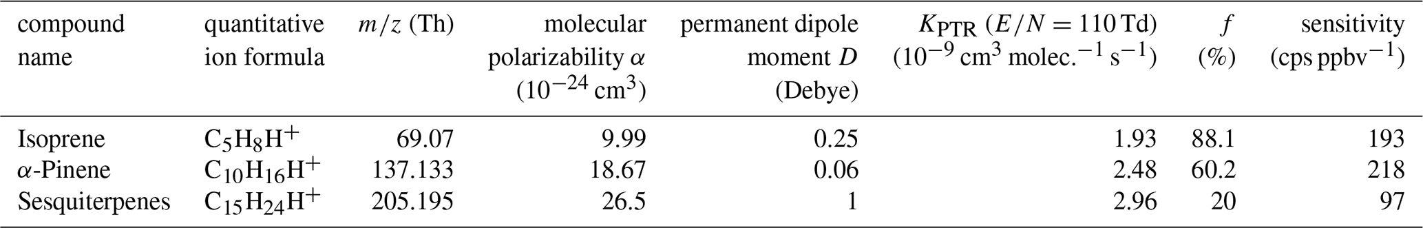 For compounds present in the calibration gas standard bottle, the corresponding calibration factor was applied directly to the processed Vocus trace data. For the remaining compounds, calibration factors were calculated using the analysis approach implemented by the PTR data toolkit as described by Jensen et al. (2023) (See Table C2 of calibration coefficients and calculated terpenoid sensitivities). The fractionation rate estimate for SQTs (0.20 ± 0.1) is based on PTR Library reference of proton-transfer reactions in trace gas sampling (Pagonis et al., 2019).