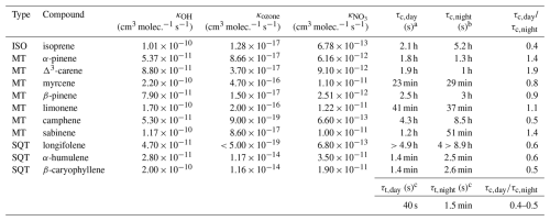 In contrast, the measured SQT flux was significantly affected by chemical degradation (see Fig. 7). For the full campaign, the estimated SQT nighttime ratio is typically ca. 0.35 (varying from 0.31 to 0.41), while the daytime ratio is ca. 0.41 (varying from 0.37 to 0.47). The mean diurnal measured fluxes and inferred SERs of isoprene, MT, and SQT, for their respective OH, O3, and NO3 reaction rate constants (Table C3 in Appendix C), are shown in Fig. 7. As a consequence, for the diurnal average over the full campaign, peak SQT nighttime emission rates are typically ca. 240 % to 310 % (mean ca. 290 %) times greater, and SQT daytime emissions ca. 240 % to 290 % (mean ca. 260 %) times greater than would otherwise be inferred solely from EC flux measurements if the effect of chemical degradation on SQT exchange and subsequent SQT flux observations were neglected.
