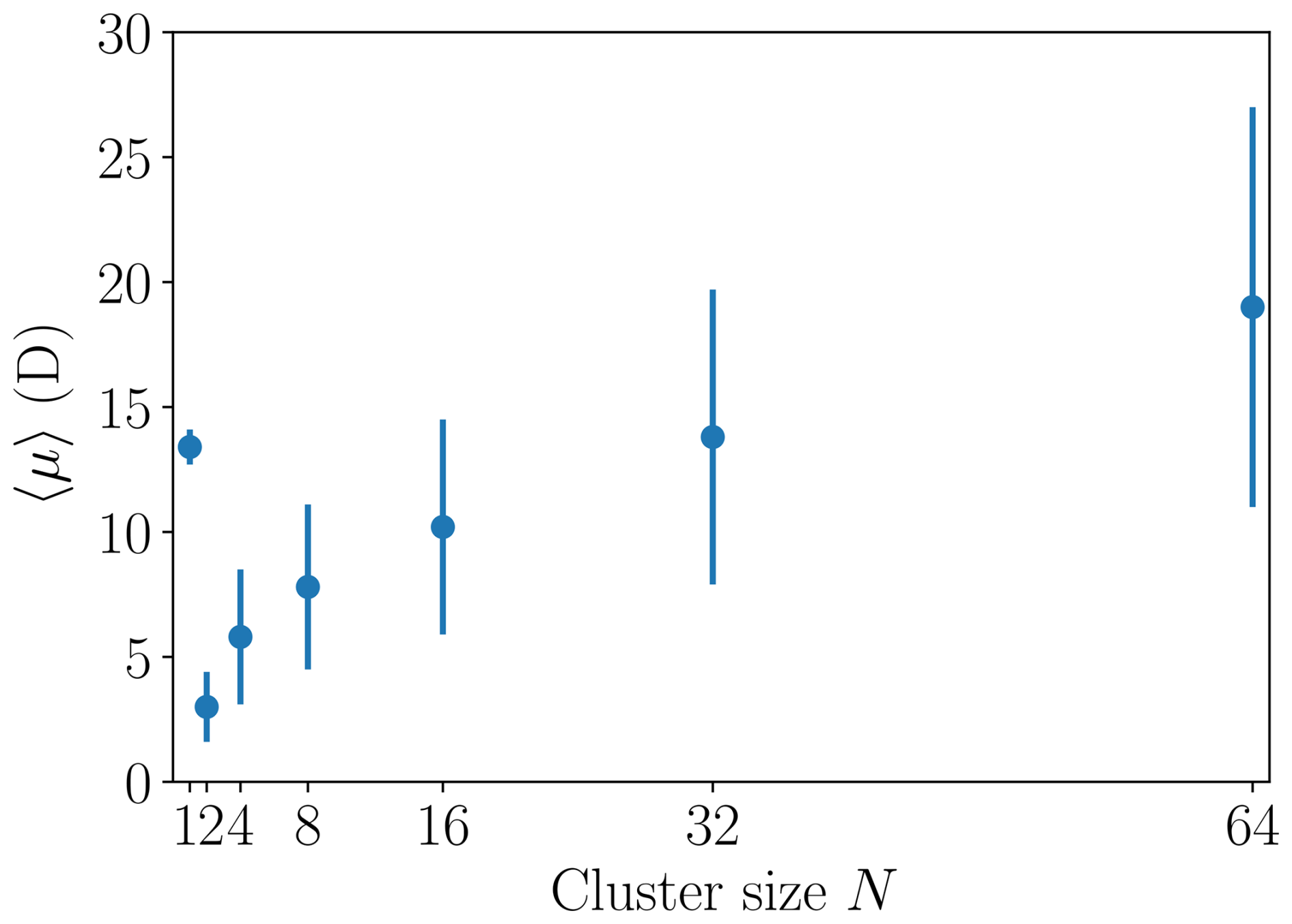 Figure 3Time average of the instantaneous dipole moment 〈μ〉 and the corresponding sample standard deviation shown as vertical lines for different [ ⋅ ]N cluster sizes N.