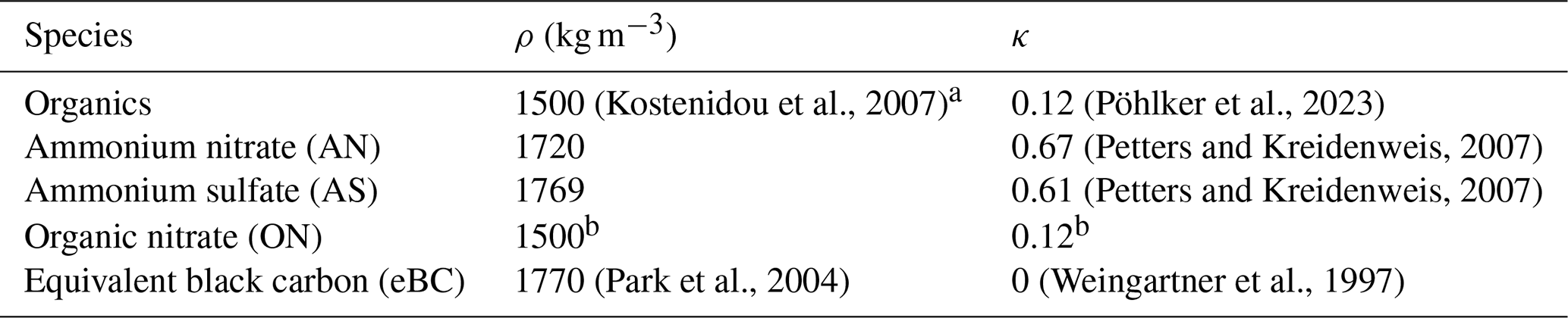 Table 1Densities (ρi) and hygroscopicity parameters (κi) of the assumed dry particle constituents based on the composition estimated from the ACSM and the aethalometer measurements.