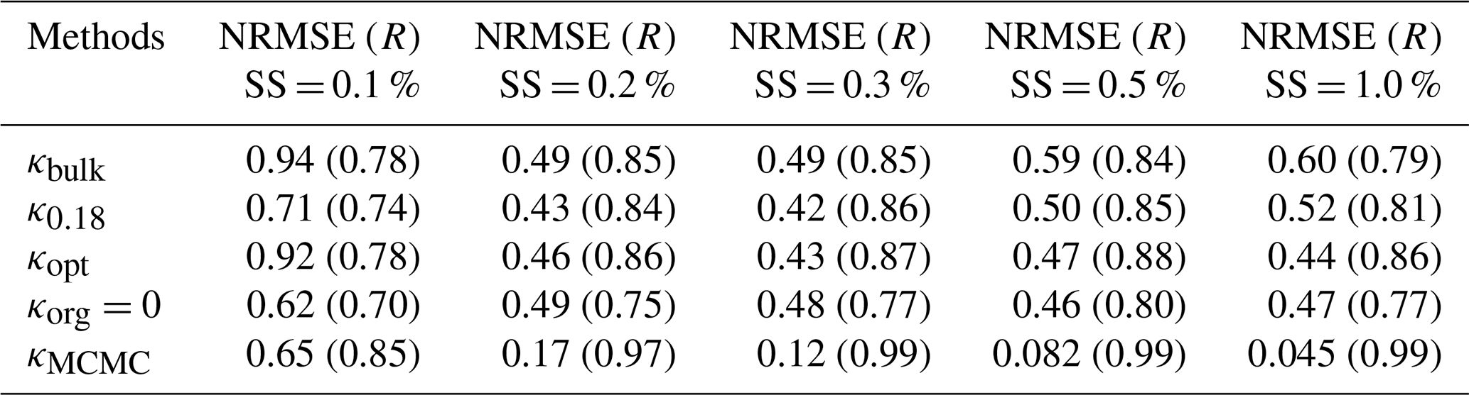 Table 2NRMSEs and Pearson's correlation coefficient (R in brackets) corresponding to different methods and supersaturations for all years taken together.