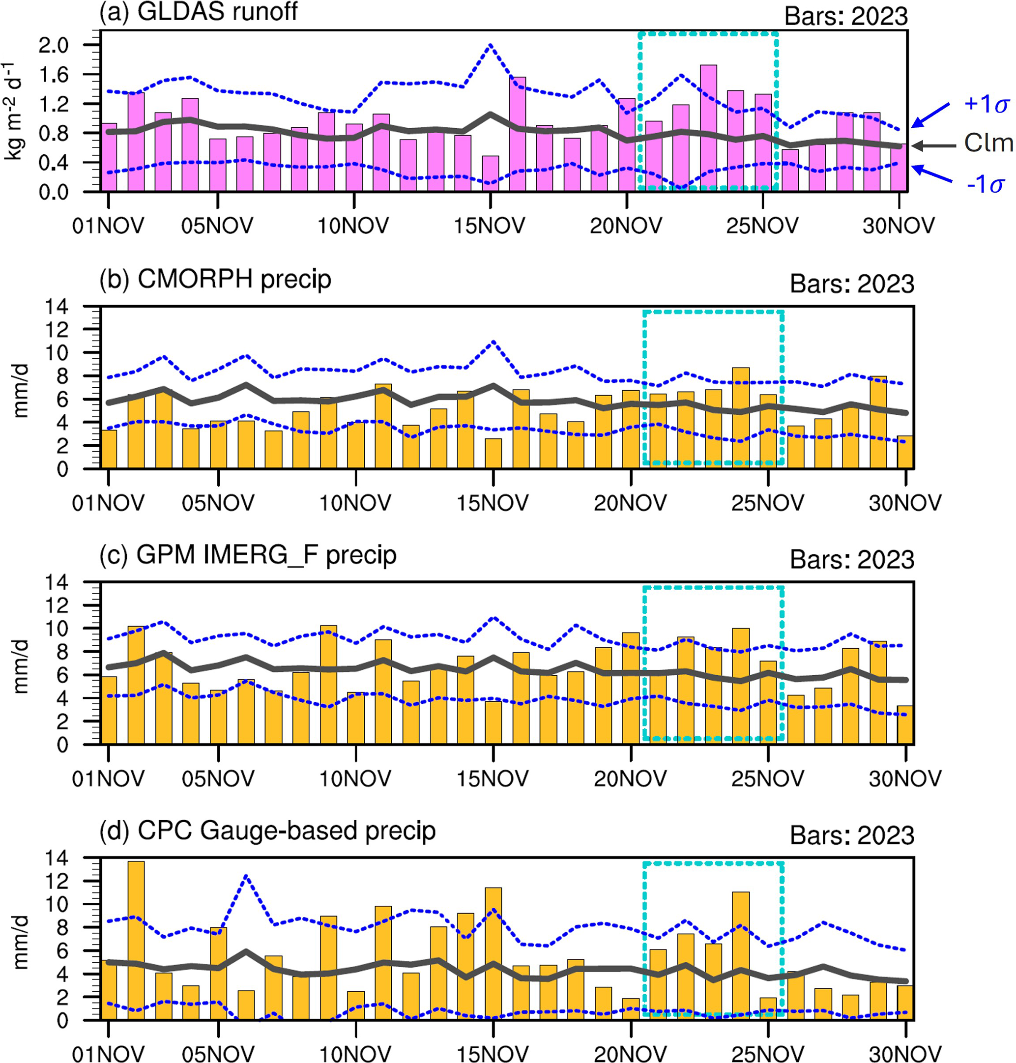 Figure 2(a) Daily mean basin-averaged runoff (kg m−2 d−1) from GLDAS for 2023 (bars), along with climatological mean (solid gray line) and the climatological mean ±1 standard deviation (dashed blue lines) for the period 1–30 November. The period analyzed in this study is within the turquoise box. (b–d) Same as (a), but for precipitation (mm d−1) from three observational datasets. The climatological period for each dataset corresponds to its available data range, as detailed in Sect. 2.1.
