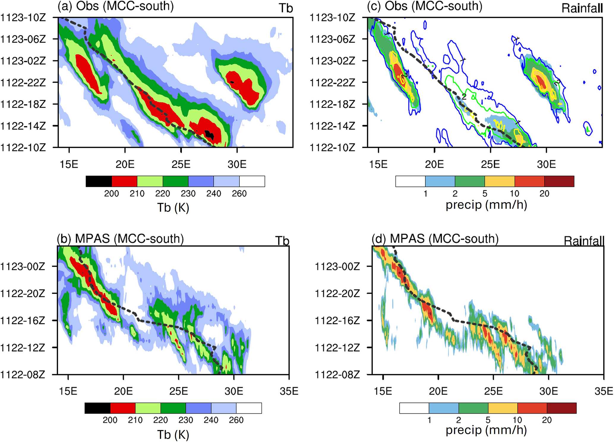 Figure 5Hovmöller diagram for (a) 6–7.5° S averaged Tb (K) from NCEP/CPC data and (b) 8–9° S averaged Tb from MPAS-A simulations, along the track of MCC-south. The black dashed line represents the MCC track. (c)–(d) Same as (a)–(b), but for precipitation (mm h−1). In (c), both CMORPH CDR (shading) and GPM IMERG (contours; contour values: 1, 2, and 5 mm h−1) precipitation are shown.