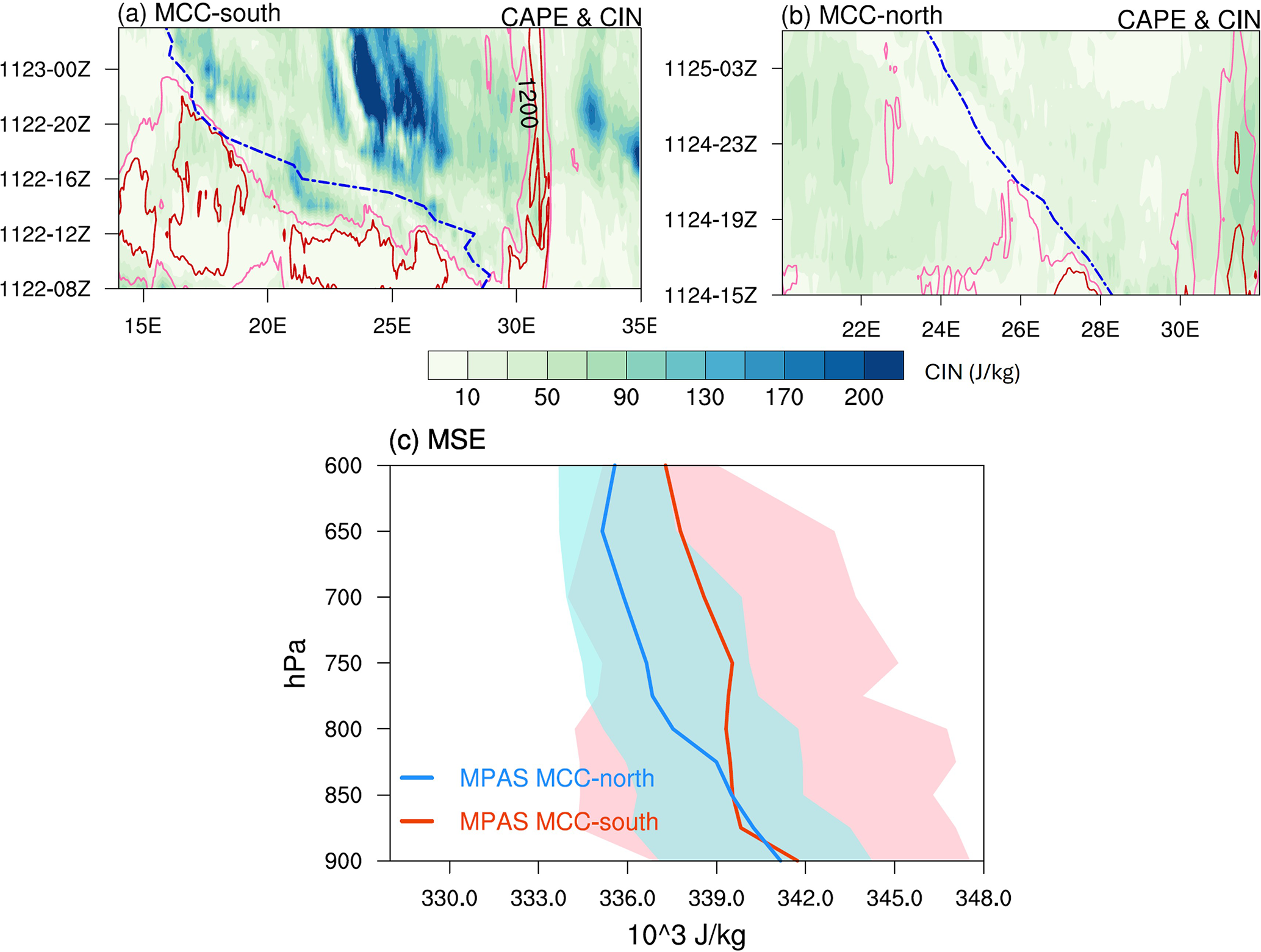 Figure 7(a) Hovmöller diagram for 8–9° S averaged CAPE (contours; J kg−1; the light and dark red contours represent 1200 and 2000 J kg−1, respectively) and CIN (shading; J kg−1) for MCC-south from MPAS-A simulations. The blue dashed line represents the MCC track. (b) Same as (a), but for 1.5–2.5° N averaged fields for MCC-north. (c) The mean MSE (103 J kg−1) for all timesteps along the track of MCC-north (blue line) and MCC-south (red line) from MPAS-A simulations. Shading represents the spread of the minimum and maximum values of MSE for all timesteps along the track.