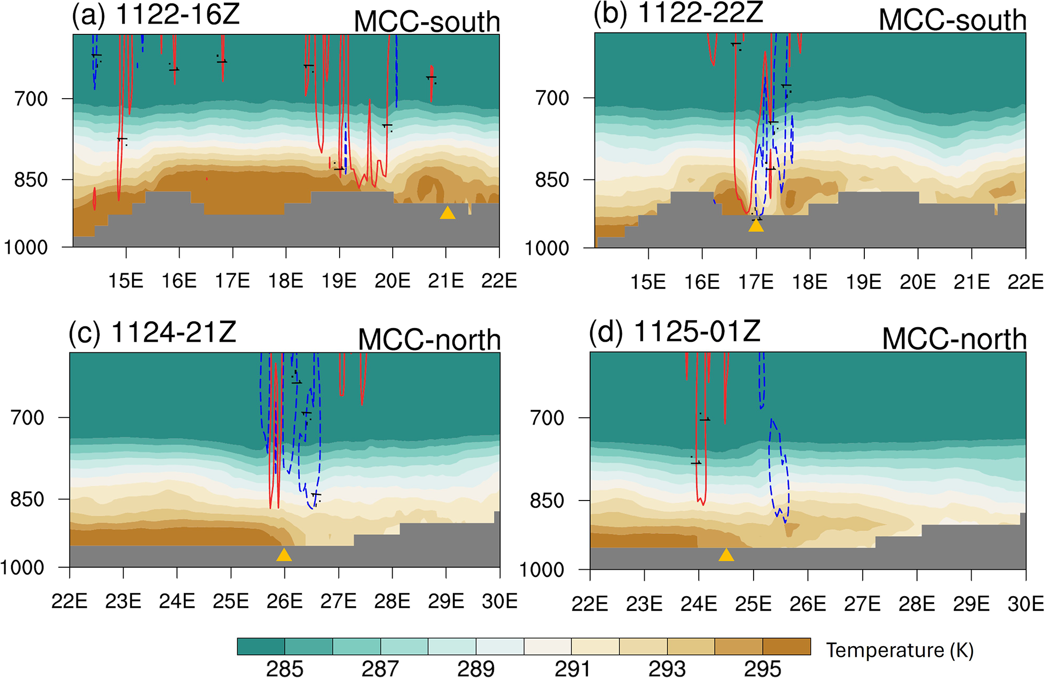 During the mid-stage (16:00:00Z) of MCC-south, its convection, linked to low-tropospheric convergence (blue shading) and updrafts (red contours), is concentrated over elevated terrain (Fig. 8a), with a cold pool region behind it (Fig. 9a). Westerly mountain-valley breezes ahead of the MCC lift moisture-rich air from the lower troposphere, providing abundant latent energy to fuel the system. As the MCC propagates into the valley, convergence intensifies from the surface to the mid-troposphere, accompanied by enhanced vertical wind shear between the lower and mid-troposphere ahead of the center (Fig. 8b) and a narrow cold pool region trailing the MCC center (Fig. 9b). The vertical wind shear ahead of the MCC-south track is generally easterly. For MCC-north, however, the system reaches the lowland forest region during its mid-stage (21:00:00Z), where the lower troposphere is dominated by divergence (orange shading), inhibiting the upward transport of low-level moisture to the mid-troposphere (Fig. 8c). The cold pool behind the MCC center extends broadly in the zonal direction (from 26 to 29° E, ∼ 300 km), with temperatures dropping by up to 4 K (291 K vs. 295 K) (Fig. 9c).