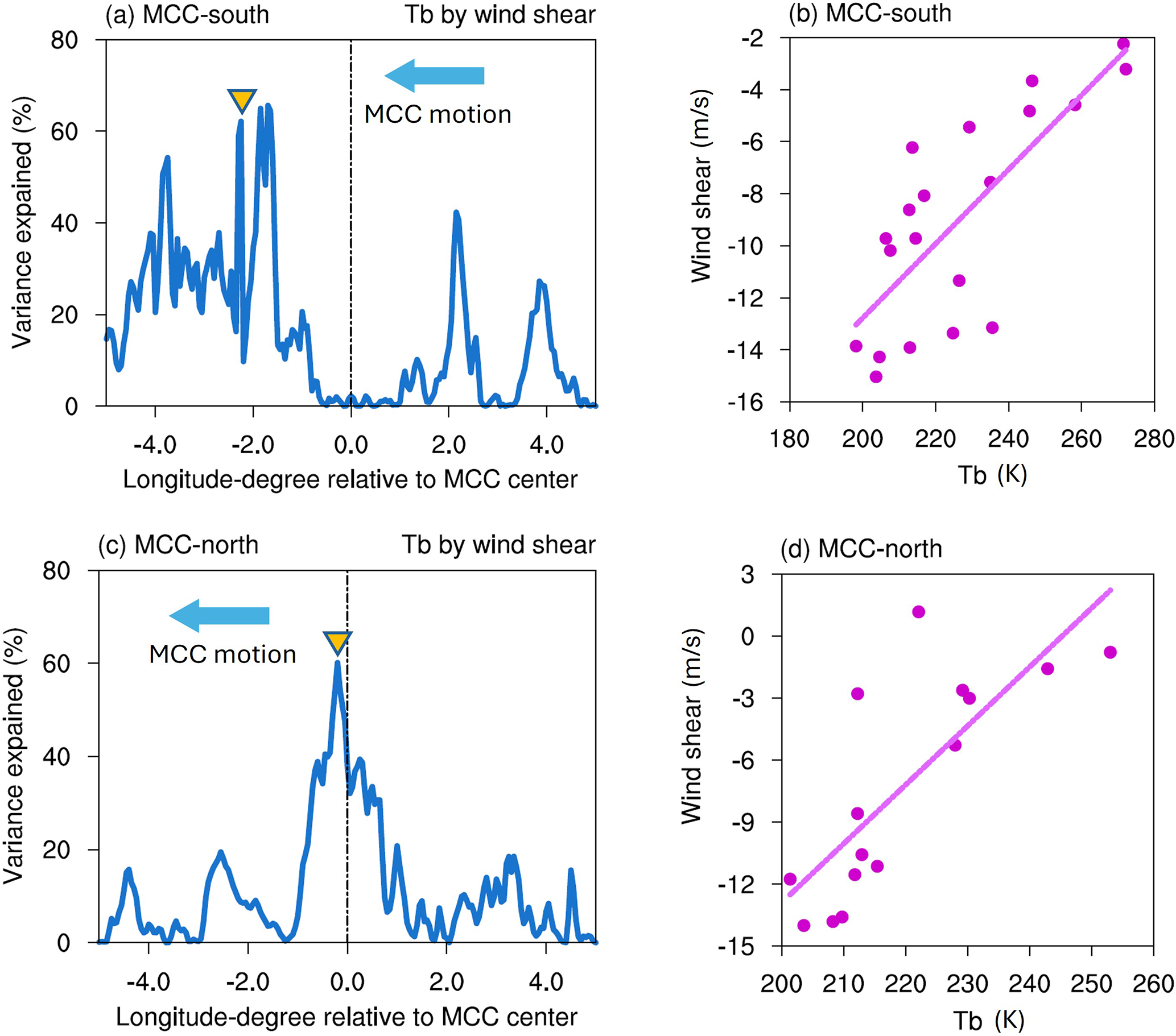 Figure 10(a) Percentage of variance (i.e., R2 × 100 %) in Tb along the MCC-south track that can be linked to vertical wind shear, shown as a function of longitude ahead and behind the MCC-south track center. The yellow triangle indicates the longitude used in (b). (b) The scatter plot for Tb (K) and wind shear (m s−1) at the longitude ahead of MCC-south track (marked by the triangle in a) for all timesteps along the track. The solid line represents the linear fit. (c)–(d) Same as (a)–(b), but for MCC-north.