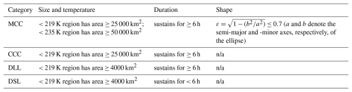 The Congo Basin MCS tracking is conducted objectively using the latest version of TAMS, an open-source, Python-based package for tracking and classifying MCSs (Núñez Ocasio and Moon, 2024). Following the MCS tracking algorithm described in Núñez Ocasio et al. (2020b) and Núñez Ocasio and Moon (2024), hourly Tb contours are used to identify cloud elements (CEs), selecting < 235 K regions that contain embedded < 219 K areas of at least 4000 km2. In MPAS-A, Tb is derived from the model's outgoing longwave radiation output following the method of Yang and Slingo (2001). MCS tracks are determined by linking CEs from the current time step to those from the previous step based on maximum CE polygon overlap. Once an MCS is identified and tracked, its complete trajectory is analyzed, allowing its entire lifespan to be assigned to a single classification. Table 1 shows the MCS classification criteria adopted from Núñez Ocasio and Moon (2024) for use in TAMS, which includes four categories: mesoscale convective complex (MCC), convective cloud cluster (CCC), disorganized long-lived (DLL), and disorganized short-lived (DSL). Other studies (e.g., Maddox, 1980; Evans and Shemo, 1996; Tsakraklides and Evans, 2003; Núñez Ocasio et al., 2020b) have similar criteria to classify MCS. TAMS outputs include the latitude and longitude centroids of < 219 and < 235 K regions for each MCS at every time step, along with additional statistics such as area, duration, and mean precipitation for each identified MCS.