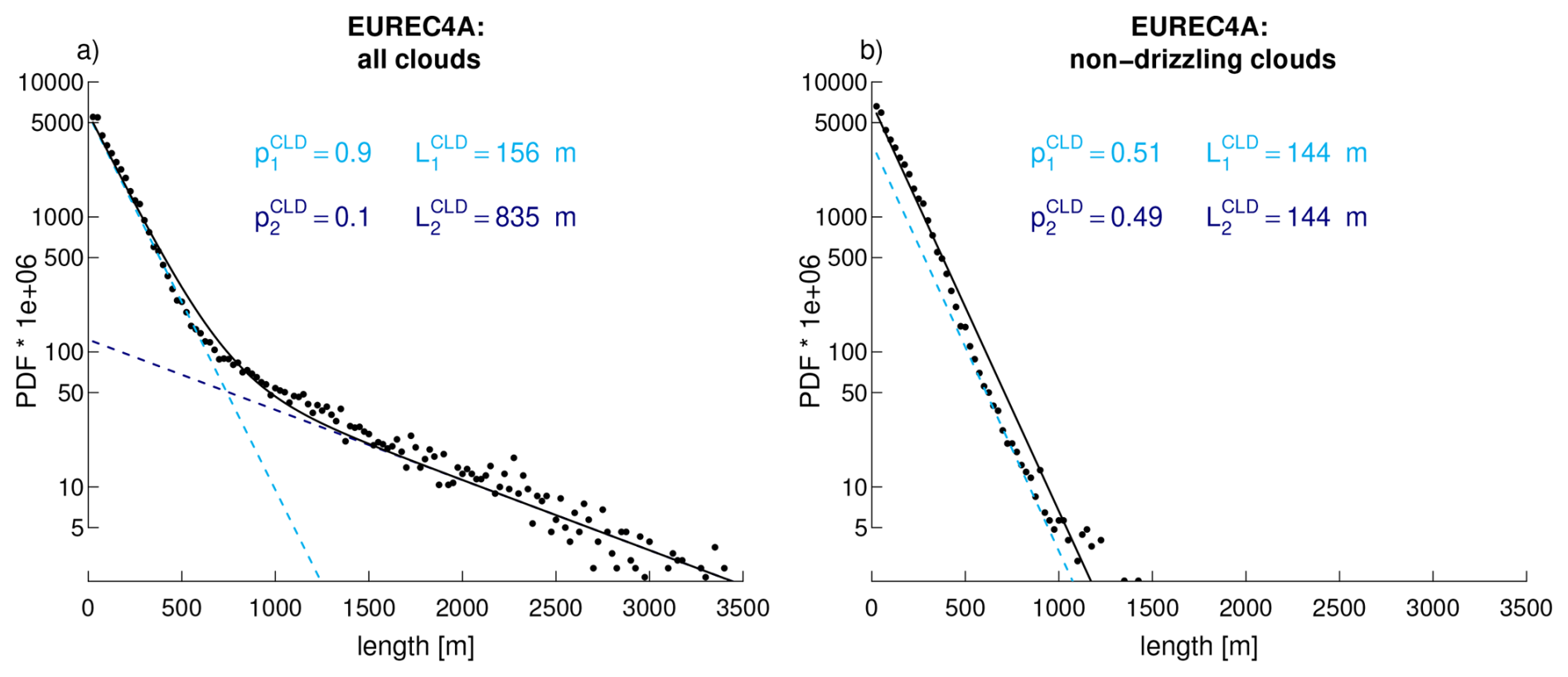 Figure 4Cloud chord length distributions derived from horizontal radar-lidar measurements around cloud base: (a) PDF obtained by considering all EUREC4A flights together fitted by a mixture of two exponential distributions (Eq. 1). (b) Same as (a) but for cloud chords devoid of drizzle. The parameters reported on each panel are those associated with each fit.