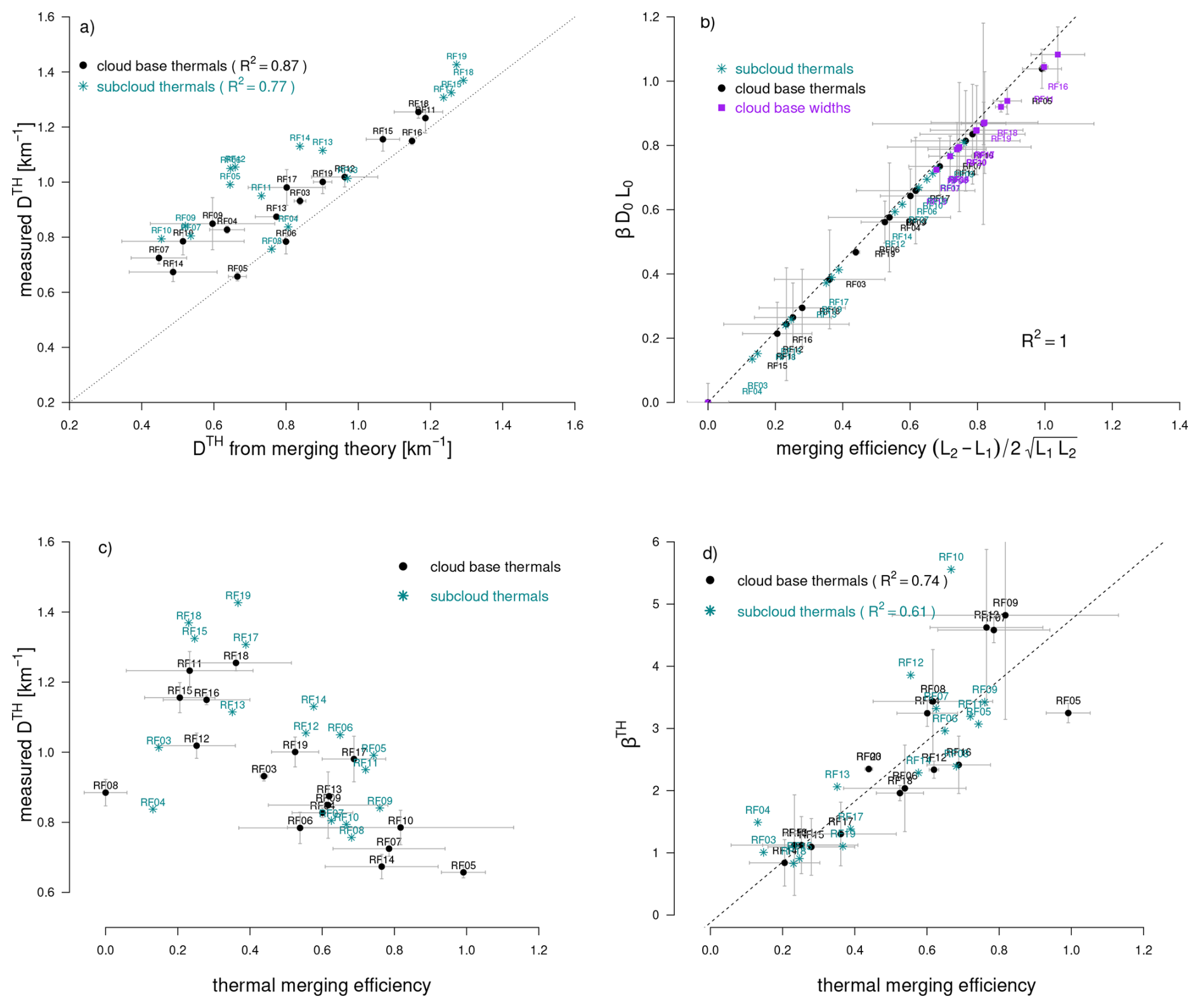 Figure 8Consistency between theory and observations: (a) Comparison of the density of thermals after merging derived from turbulence measurements or predicted from theory using Eq. (9). Each point represents one ATR research flight (Table 1). Horizontal and vertical bars represent errors on the mean calculated from the measurements associated with the different rectangles flown near cloud base. Turquoise and black markers correspond to thermals sampled in the subcloud layer and near the cloud base, respectively. (b) Relationship (shown for thermals and clouds) showing the equivalence between the theoretically defined merging efficiency β𝒟0L0 and the quantity derived from chord length distributions. (c) Relationship between the thermal merging efficiency, defined as , and the measured thermal density (after merging). The relationship is shown for thermals sampled either in the subcloud layer or near cloud base. (d) Relationship between the effective length parameter of thermals βTH and the thermal merging efficiency. A value larger than one means that thermals influence each other even without touching owing to the return circulation they induce around them. In (a) and (b) the dashed line is a 1 : 1 line, and in (d) it is the linear regression line for the cloud base thermals. Error bars correspond to standard errors around the mean estimated from the two or three rectangles flown at cloud base during each flight.