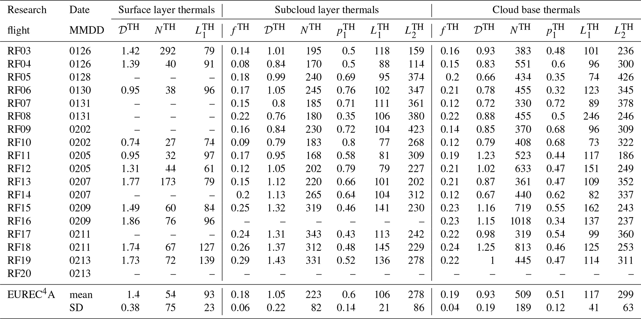 Table 1Thermals observed during EUREC4A in the surface layer, the subcloud layer and near cloud base: For each ATR flight, fTH is the thermal coverage, 𝒟TH is the thermal density (in km−1), NTH is the number of chords, and (), and (in meters) are the parameters of the double exponential fit (see Eq. 1). In the surface layer, the fit is close to a single exponential. Therefore, for the sake of space we report only 𝒟TH, NTH and . The flights (or flight segments) without data are indicated by “–”: no turbulence data are available for RF20 (failure of the inertial navigational system) and on the near-surface leg of RF14 (humidity measurements of bad quality), the near-surface was not sampled by the aircraft in RF05, RF07, RF08, RF09 and RF17, and the subcloud layer was not sampled during RF16.