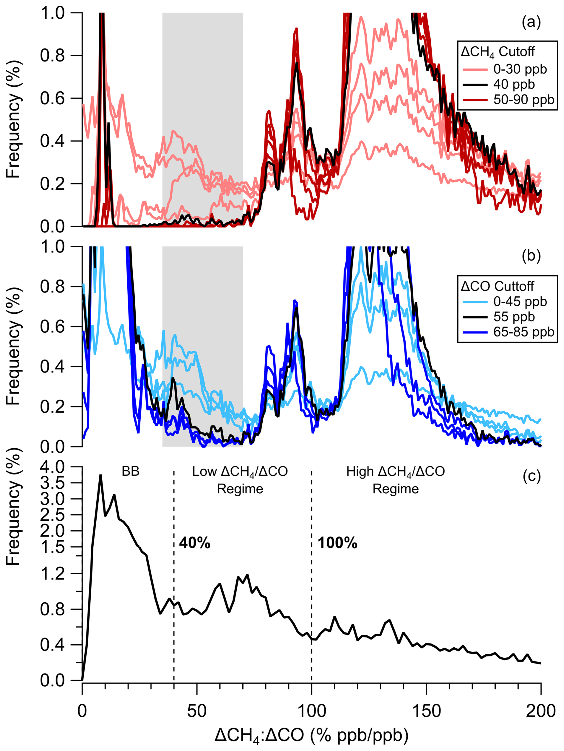 Figure 1Sensitivity test of ΔCH4/ΔCO emission ratio distributions to concentration cutoffs in (a) CH4 and (b) CO. Shaded area shows the minimum in ΔCH4/ΔCO chosen to separate the regimes above the selected cutoffs at ΔCH4=40 ppb and ΔCO = 55 ppb. (c) Frequency distribution of ΔCH4/ΔCO enhancement ratios showing rolling slope regimes, with dashed lines representing the slope cutoffs between regimes at 40 % and 100 % ΔCH4/ΔCO.