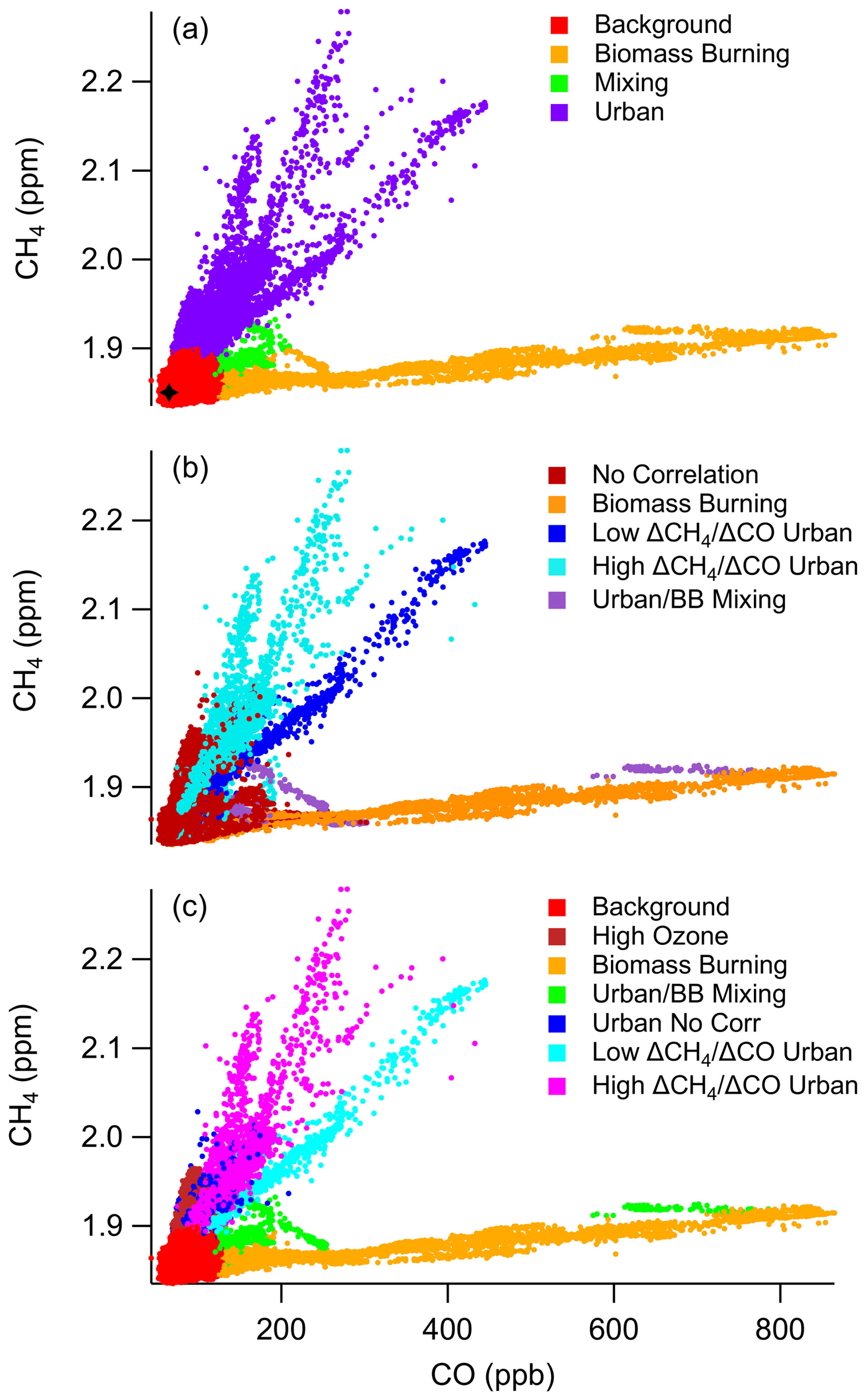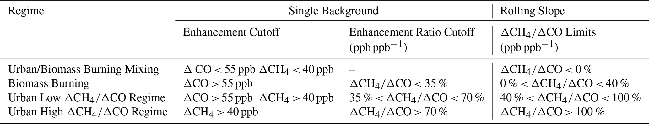 The final flag background and biomass burning regimes were equivalent to those assigned by the single background method. The urban regime from the single background method was split into three separate regimes based on the correlated slope (or lack thereof) from the rolling slope method. The negative-slope correlated regime was combined with the urban/BB mixing regime from the single background method to form the final urban/biomass burning mixing regime. Figure 2c shows the final regime apportionments with respect to CH4 and CO, while Table 1 shows the final cutoffs in both tracer enhancement and enhancement ratios for each method.