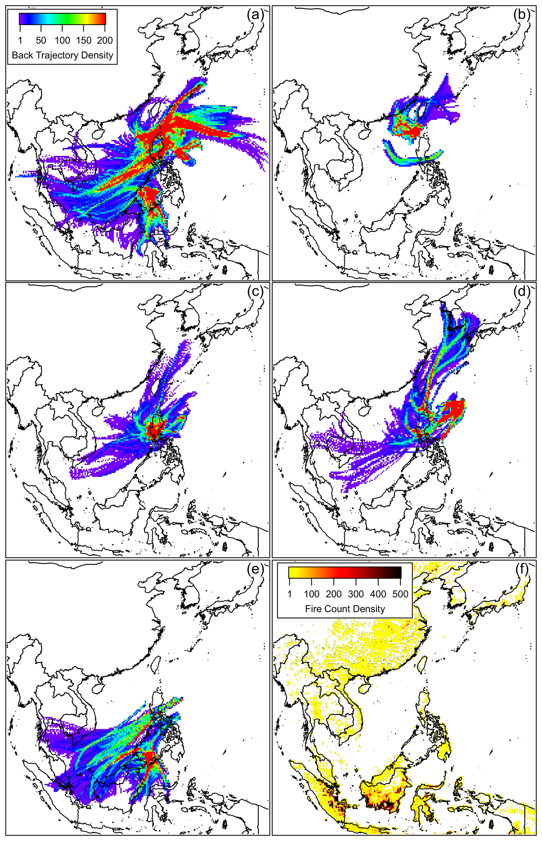Figure 3Heat map of HYSPLIT 48 h back trajectories at 1 h resolution initialized every 5 s from flight track < 2 km, separated by regime: (a) background, (b) low ΔCH4/ΔCO urban, (c) high ΔCH4/ΔCO urban, (d) uncorrelated urban, and (e) biomass burning. (f) Heat map of VIIRS 375 m fire counts during September 2019.