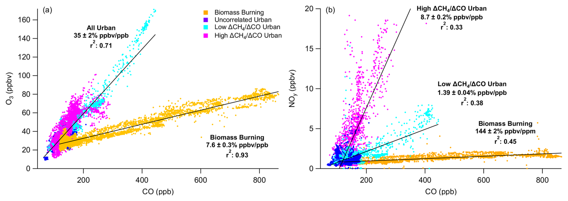 In contrast, CO and methane (CH4) are inefficiently scavenged by precipitation and cloud processes due to their low solubility, leaving dominant photochemical loss pathways typically on the order of many days to weeks for CO (Holloway et al., 2000; Khalil and Rasmussen, 1984) and years for CH4 (Cicerone and Oremland, 1988; Naik et al., 2013; Voulgarakis et al., 2013), slow on the scale of regional or mesoscale transport. Thus, correlated enhancements between CO and CH4 (ΔCH4/ΔCO) can be primarily related to the air mass source. Biomass burning has been widely reported in the literature to have low ΔCH4/ΔCO enhancement ratios or emission ratios compared to the higher values reported from fossil fuel combustion. For example, based on shipborne measurements in the South China Sea while heavily influenced by biomass burning, Nara et al. (2017) reported a typical ΔCH4/ΔCO enhancement ratio of 7.95 ± 0.21 % ppb ppb−1. Worden et al. (2017) report biomass burning ΔCH4/ΔCO emission ratios between 0 % ppb ppb−1 and 20 % ppb ppb−1 over a variety of global domains based on Aura TES retrievals and GFED-driven GEOS-Chem modeling. In contrast, Helfter et al. (2016) observed CH4/CO flux emission ratios between 60 %–500 % during urban eddy covariance flux studies over central London, UK, and Plant et al. (2019) observed mean ΔCH4/ΔCO enhancement ratios between 48 % ppb ppb−1 and 130 % ppb ppb−1 from airborne studies over six Eastern US cities.