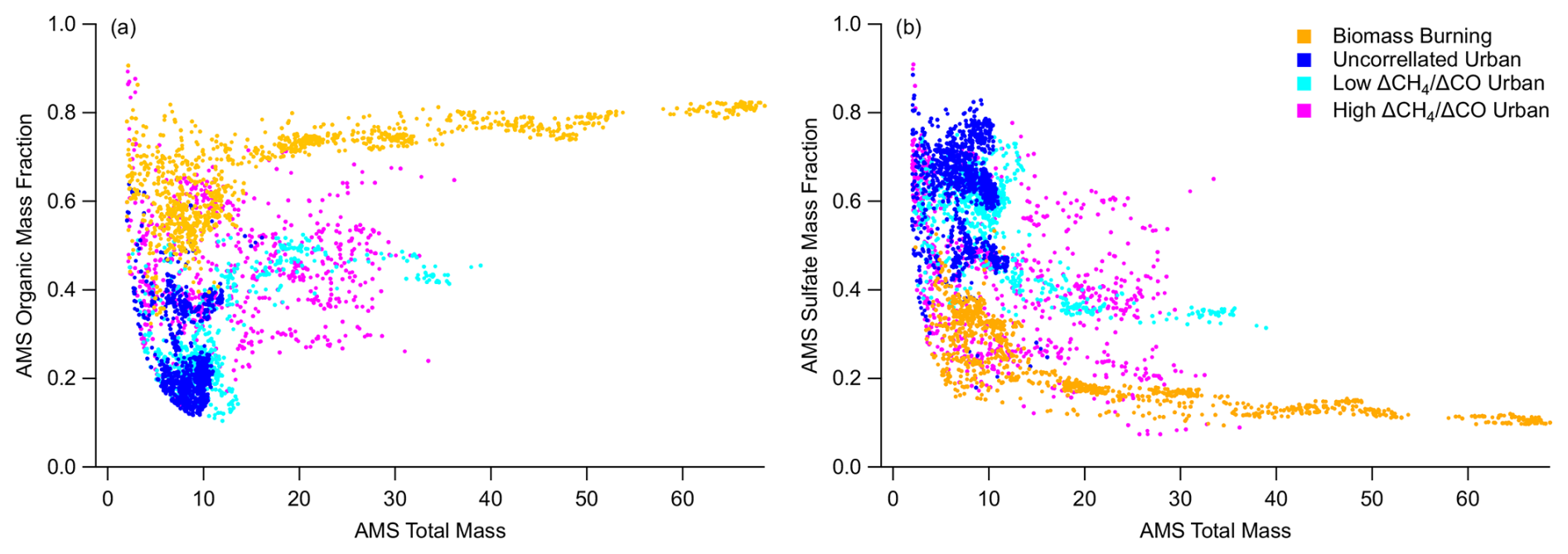 Figure 6 shows the trend in relative mass fraction contributions for the two dominant aerosol mass contributors, organic and sulfate, as a function of total aerosol mass in the biomass burning and urban chemical regimes. Within the urban regimes, there was large variability in the mass fractions for both organic and sulfate. One exception seems to be that the mass fractions asymptote at nearly 50 % (organic) and 35 % (sulfate) of total aerosol mass within the low ΔCH4/ΔCO urban regime, though this could be an example of the more limited observations of this regime. In the biomass burning regime, the mass fractions have high total mass asymptotes near 80 % (organic) and 10 % (sulfate).