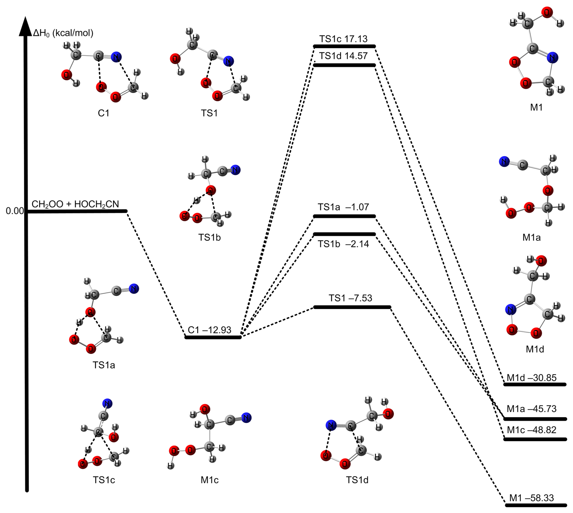 Figure 1The relative enthalpies at 0 K for the reaction of CH2OO + HOCH2CN. Values are given for all species as calculated by M11-L/MG3S.