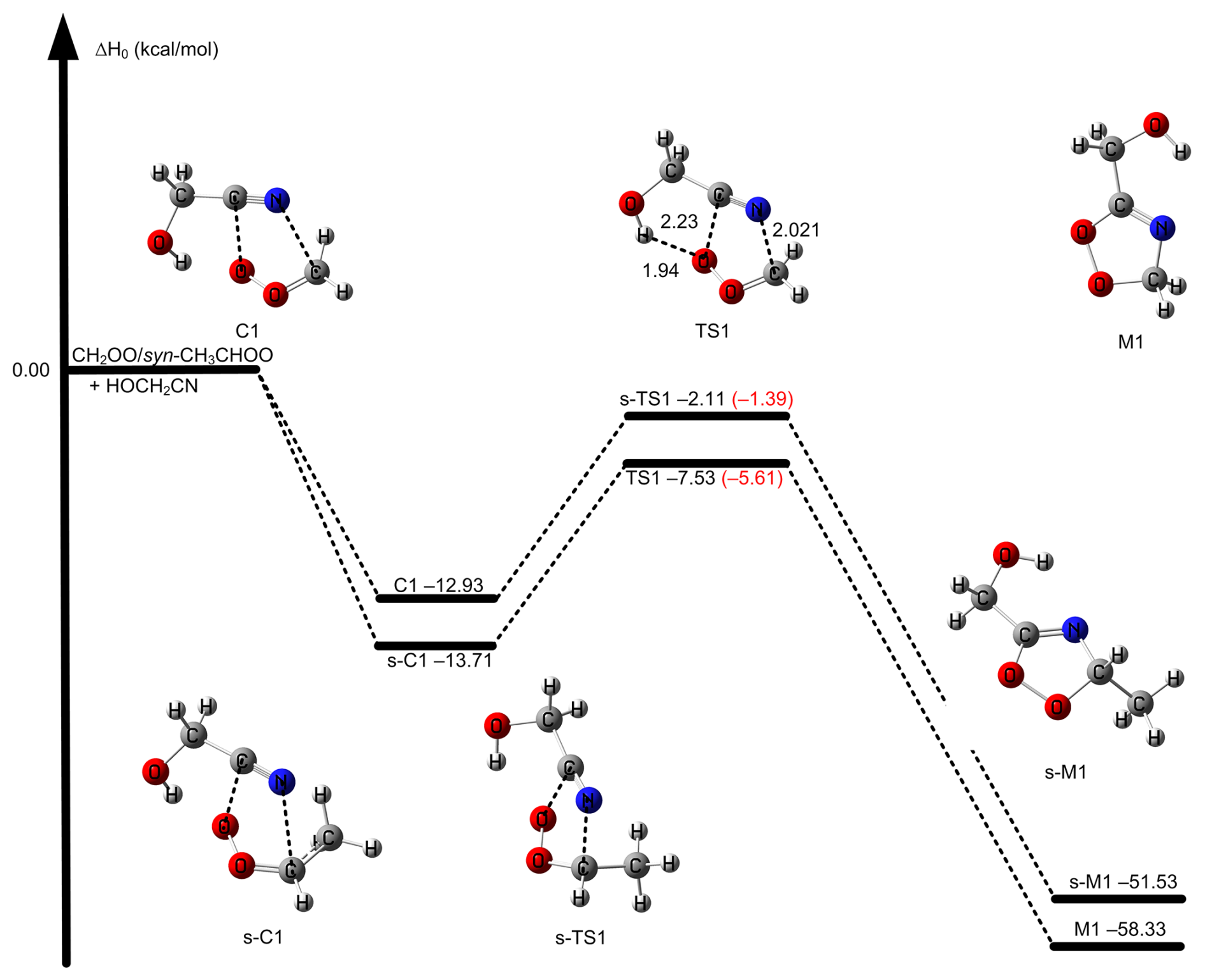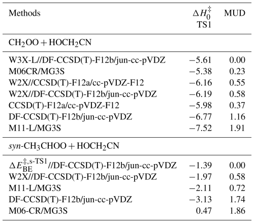 Table 1The enthalpies of activation at 0 K for the transition states of the CH2OO/syn-CH3CHOO + HOCH2CN reactions by various theoretical methods (in kcal mol−1).