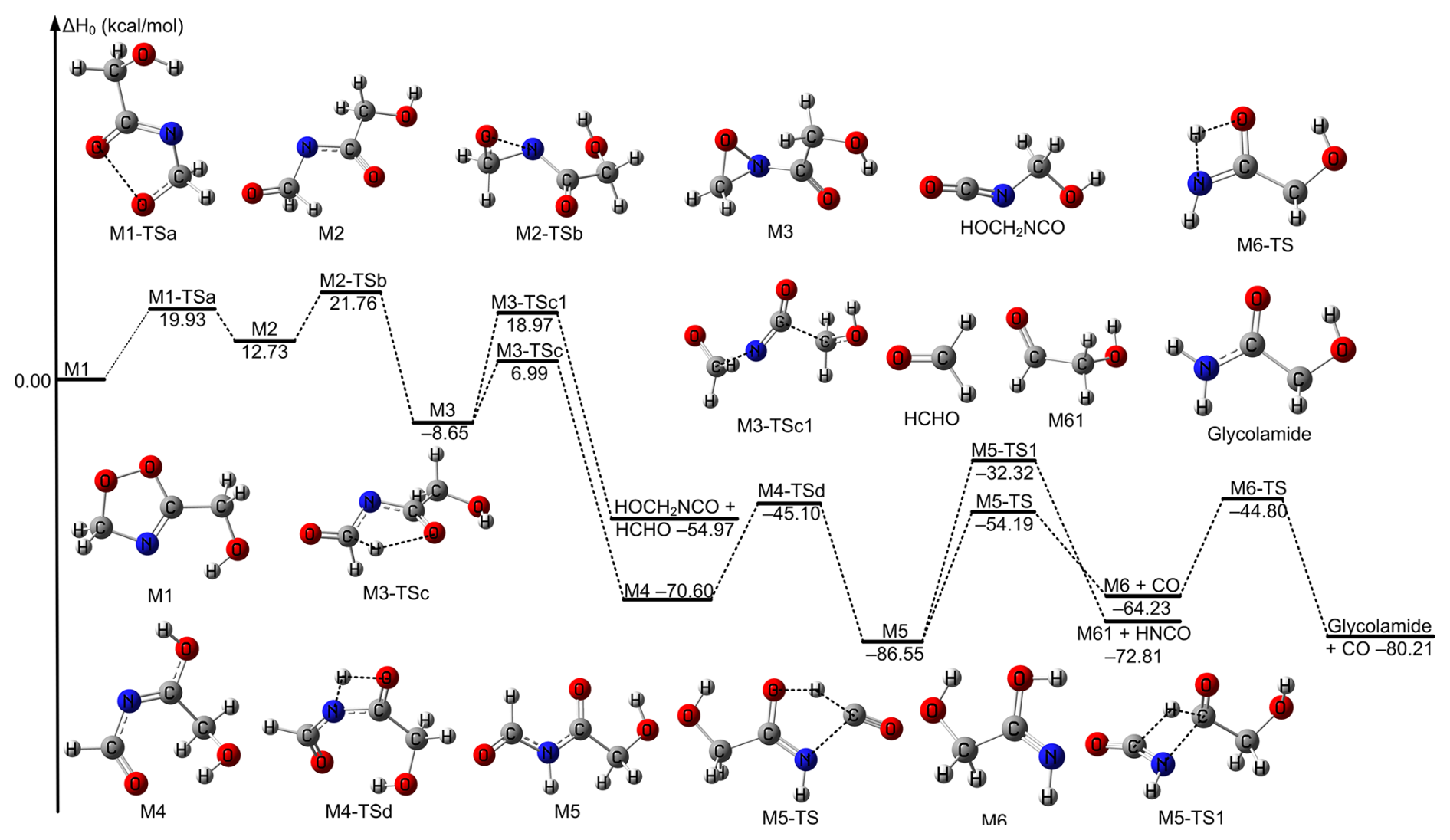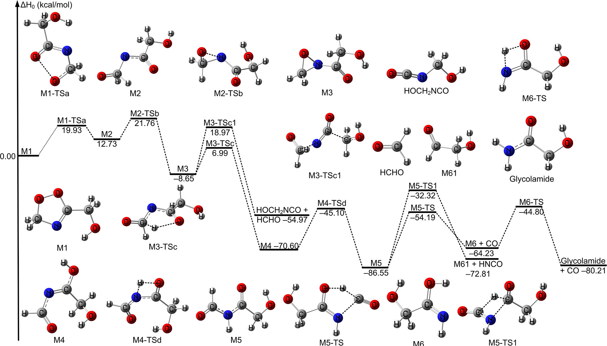 Figure 3The relative enthalpies at 0 K for the decomposition reactions of the intermediate product M1 formed in the CH2OO + HOCH2CN reaction. Values are given for all species as calculated by M11-L/MG3S.