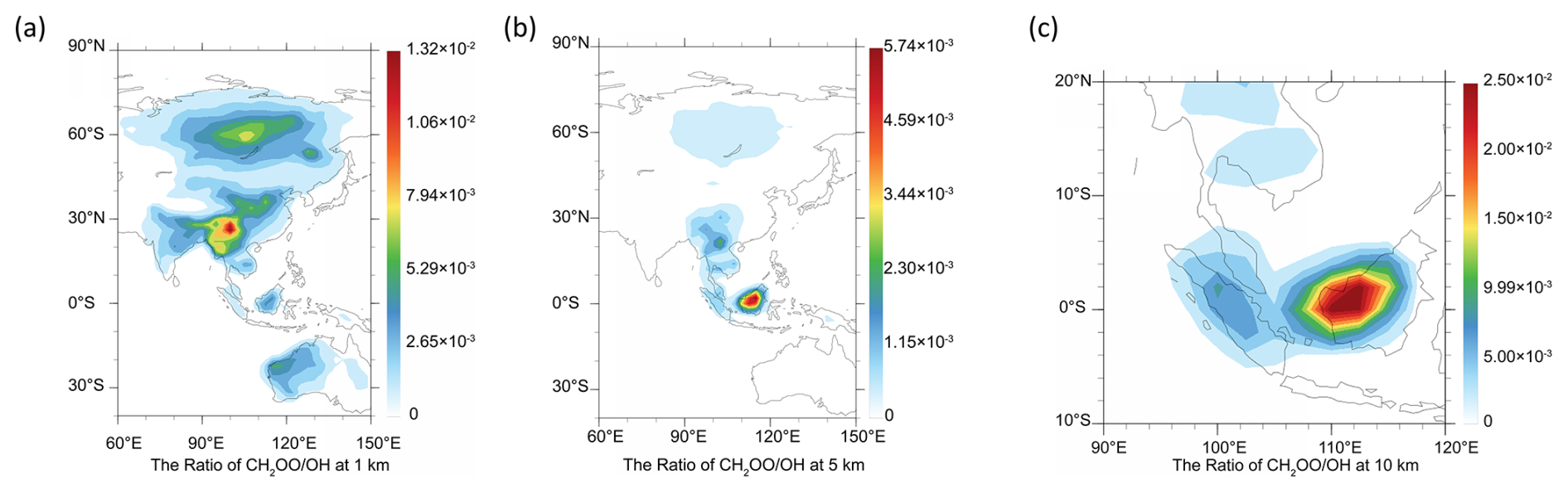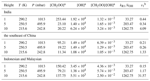 Table 3The concentration ratio of CH2OO to OH at different heights from different region in GEOS-Chem.