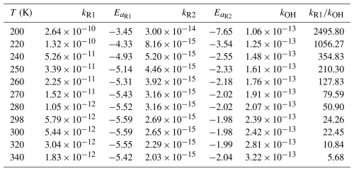 The rate constants for Reactions (R1) and (R2) have been calculated and listed in Table 2. The details are listed in Tables S5 and S6. We have fitted the calculated rate constants by Eq. (3).