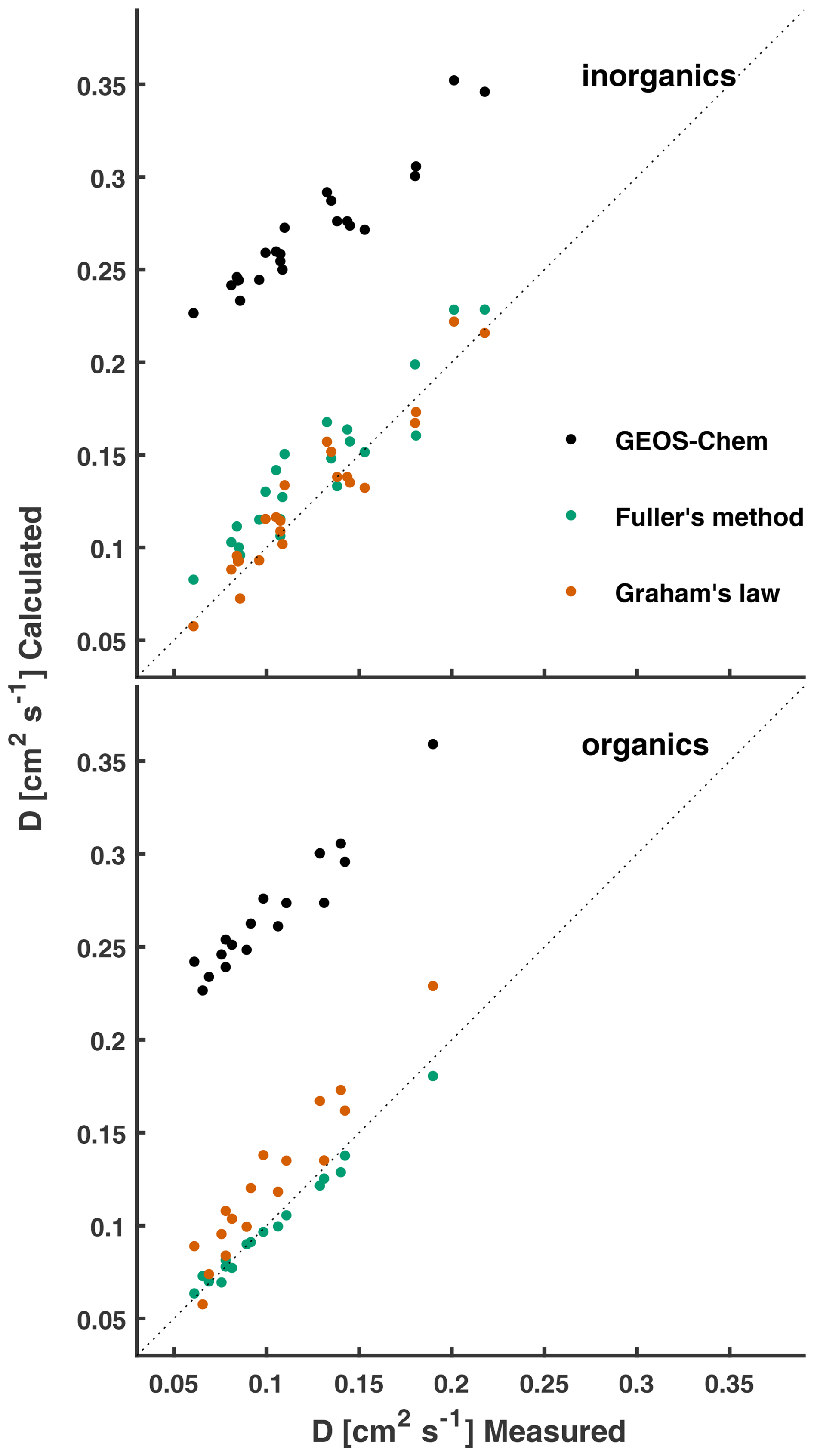 Figure 1 also depicts molecular diffusion coefficients approximated by Graham's law of effusion, i.e., (Mason and Evans, 1969), where (continuum) diffusion coefficients are approximated by the Knudsen diffusion coefficients Dk – an oversimplification of Eq. (5) and a strategy commonly used in the atmospheric science community (Nguyen et al., 2015; Weber and Renenberg, 1996; Wesely, 1989). The resulting diffusion coefficients scaled from measured correlate well with the measured values (R2=0.91), with normalized mean biases (NMBs) to inorganic and organic species of 3 % and 20 %, respectively. In a review of molecular diffusivities of atmospherically relevant molecules, Massman (1998) note that misapplication of Graham's law to molecular diffusivities can lead to errors of up to 23 %. Measured and computed diffusion coefficients from Fuller's method, assuming air as the bath gas, are presented in Fig. 1 and tabulated in Table S1. We do not differentiate between diffusivity measurements carried out in air and in N2, as differences are expected to be small, i.e., a 2 % difference in at STP in air vs. in N2.